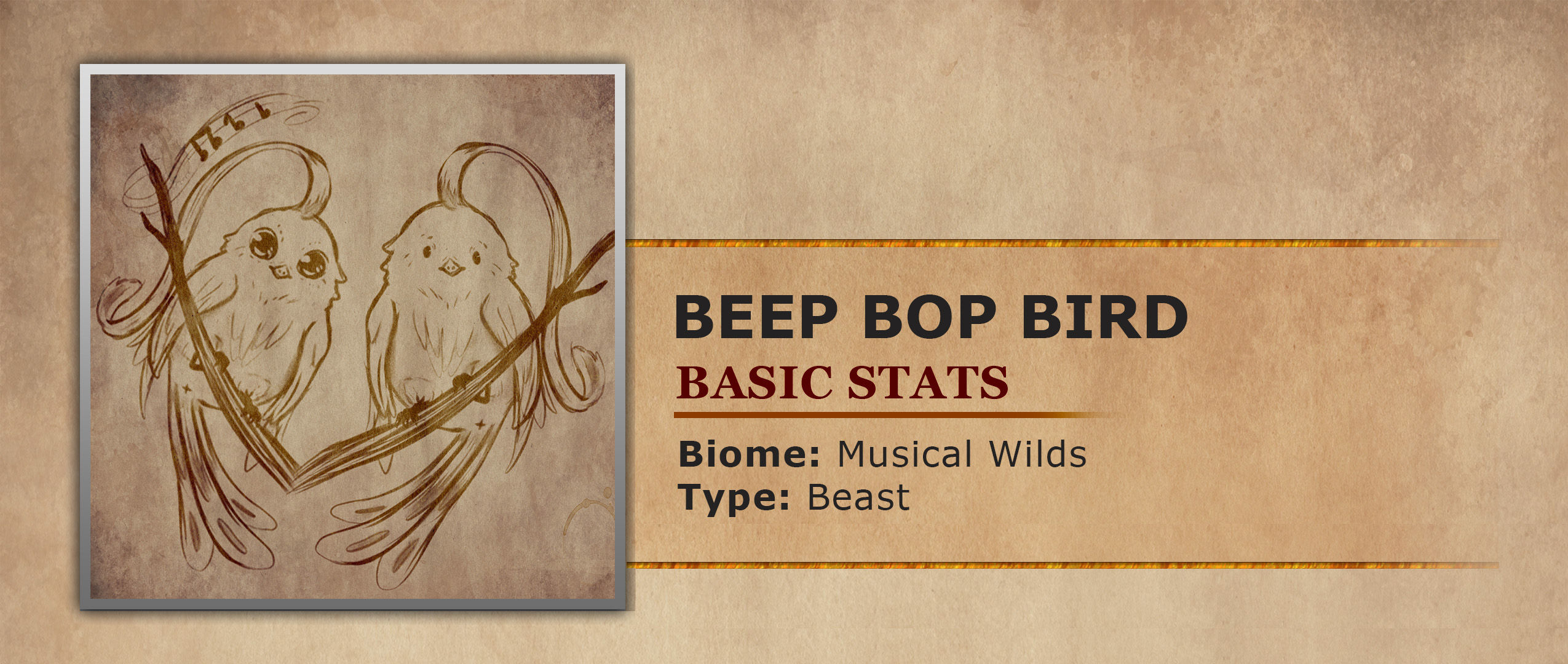 These colourful avian creatures are attracted to harmonious tones. The better the quality of the music, the more of them you'll attract. They will fly in mesmerising formations as their wings soar through the music carried on the wind. If they feel safe they will land and dance and sing along to the music. They have a large, silky golden tuft at the top of their head that flows down their back. When they bop up and down as they dance and sing, the tuft reacts to the melody. Their feathers come in many varieties of colours. Some say that their colours are dependent on which type of music they like most. Not only are the colors indicators of their preferred music but oddly enough the size of their eyes. It is said that Beep Bop Birds with small beady eyes are more receptive to lower octaves while those with large bulbous eyes prefer higher octaves. Despite their taste in tones all of them have the same row of golden feathers at the edges of their wings. Their size is usually quite small, with short beaks and a plump round body. However, legend says that the more they are exposed to different types of music, the larger they grow in size.