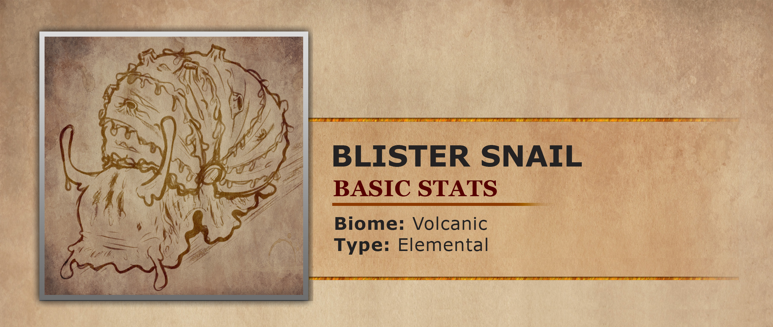Blister Snails are elementals composed of volcanic rock and magma, resembling enormous gastropods growing to the size of large boulders. They spend most of their lives deep beneath the surface of volcanoes, submerged in magma. In this environment, they are nearly impossible to distinguish from the surrounding molten rock and igneous material. However, during volcanic eruptions, they are sometimes forced to the surface. This has led to local settlers in or around volcanic regions to regard Blister Snail sightings as early warnings of seismic or volcanic disturbances, using them as natural indicators of impending eruptions.