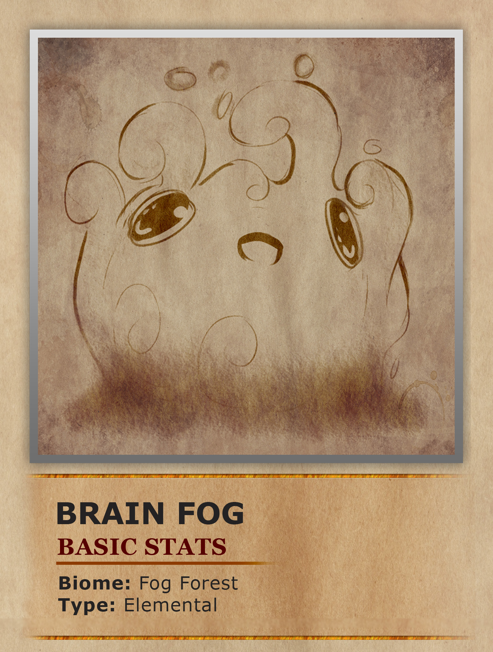 Brain Fogs are small elementals made of mist that dwell within the realm between realms. Originally created by Gloamhitchs who while performing their early experiments in fog manipulation learned they could do more than simply alter the shape of the fog, but also breathe life into it. The only problem is once the Brain Fogs were created the Gloamhitchs realized they had very limited control over them and eventually abandoned their creations. See the Brain Fogs as their name would suggest are the living embodiment of the confusion and disorientation making them very poor at taking orders. Now the Brain Fogs wander the Fog Forest looking to make friends with whoever they find. Whether it be mortal souls, traveling adventurers or other monsters lurking in the forest. Despite the Fogs simply wanting companionship their love comes at a cost. Whenever a Brain Fog finds a friend it will float over and hug their face, which possesses the being. While possessed the host feels a sense of confusion making it likely that they will venture off of the trail or walk right into danger. While they may cause unforeseen dangers the possessed host is also granted additional vitality from the magic they possess.