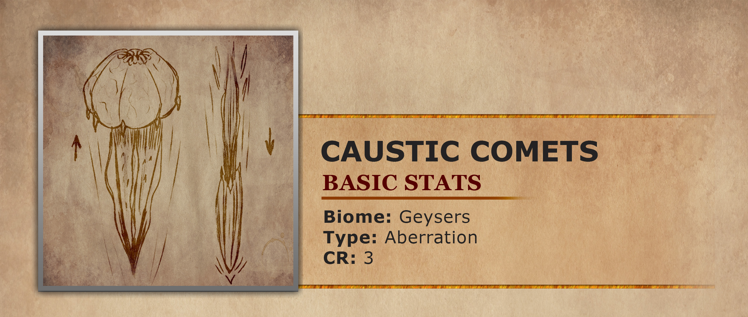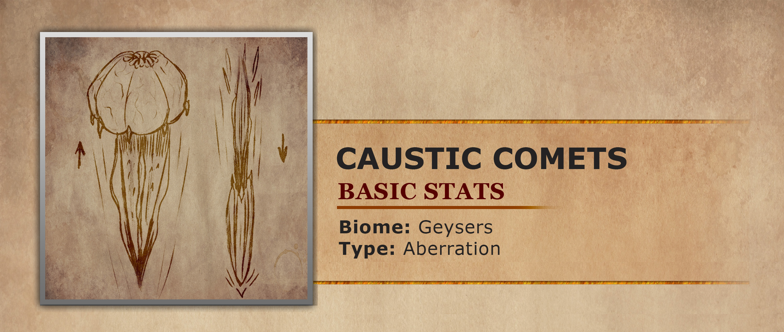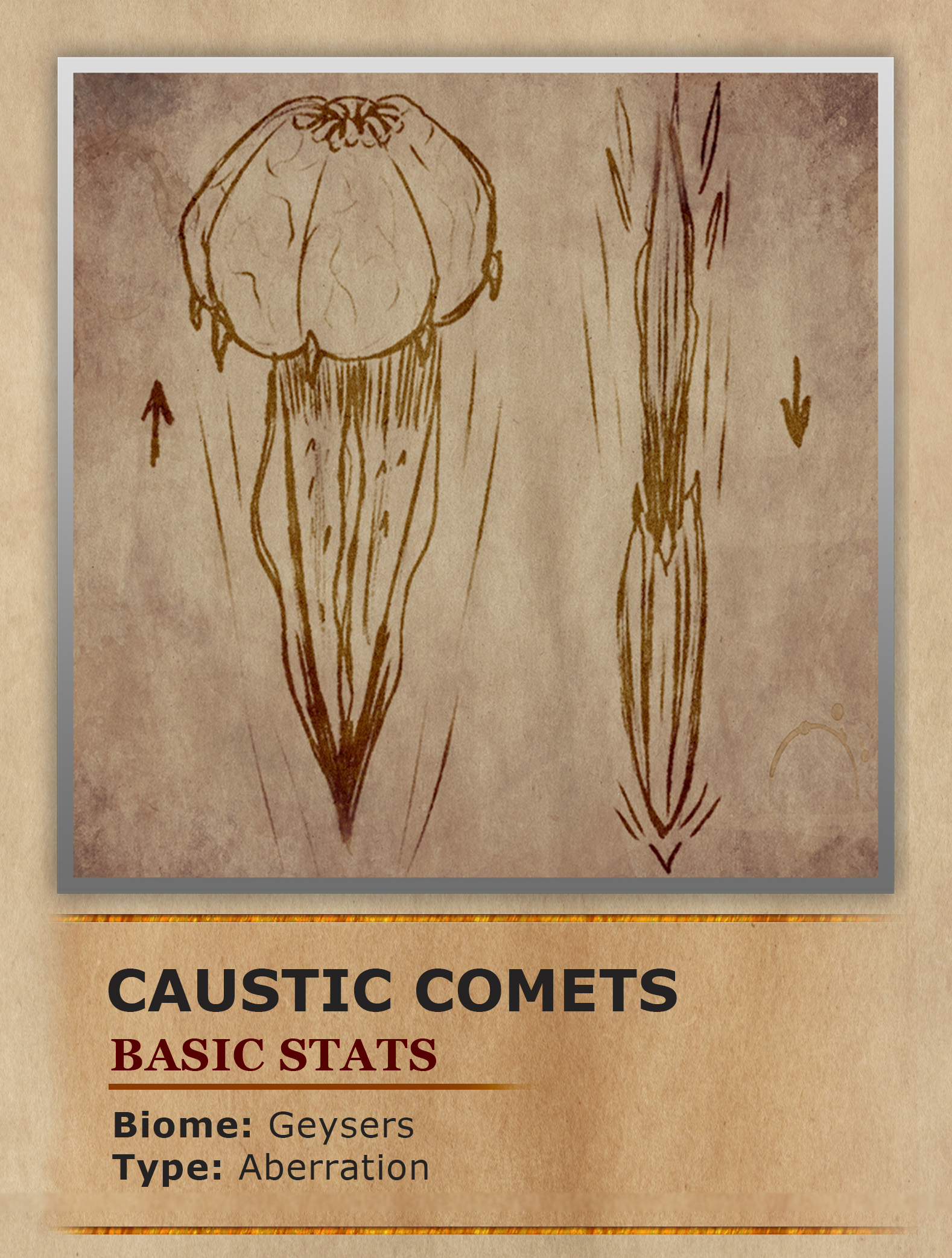 Floating like balloons above the bubbling geyser pools are strange jellyfish-like creatures thought to originate from beyond the stars, known as Caustic Comets. These airborne carnivores use the hot air produced by the geysers below to give their light membranous bodies lift, enabling them to fly. This method of flight combined with their lightweight bodies allows Caustic Comets to reach great sizes of up to 50ft(15 meters) in diameter. Regardless of their size these creatures control their elevation by simply expanding their bodies outward to gain height and contracting it to lower themselves. Their mouths are located on top of their bodies and are full of multiple rows of omni-directional teeth. While they lack normal eyes the Comets have another way of seeing using the electromagnetic spectrum. This allows them to sense the electrical signals coming off of their prey. So when hunting a comet will wait until it identifies a strong electrical signal below it before zeroing in on the attack. When attacking the Comet turns itself upside down and fully contracts its body in order to fall down towards its prey at blinding speeds. This hunting method allows even small Caustic Comets to take down prey, as the force of their impacts can cause immediate deaths. However, Comets must be swift when feeding on their kills in the bubbling geysers below. Predators like Melter Maws would love to snack on a juvenile Caustic Comet. After eating their fill, the Comets then have to find a way to create the necessary boost to take spring from the water and back into the sky. Luckily the Comets solve this by storing the scalding water of the geysers into their bodies like a sponge and releasing it to propel them upwards like a rocket. This gives the Comet the necessary boost to then use the geyser's hot air to get them the rest of the way into the skies above.