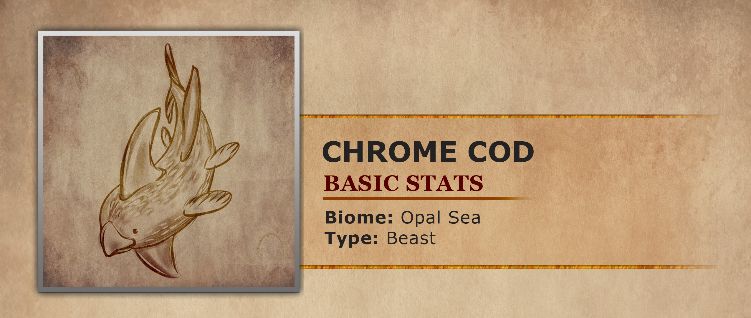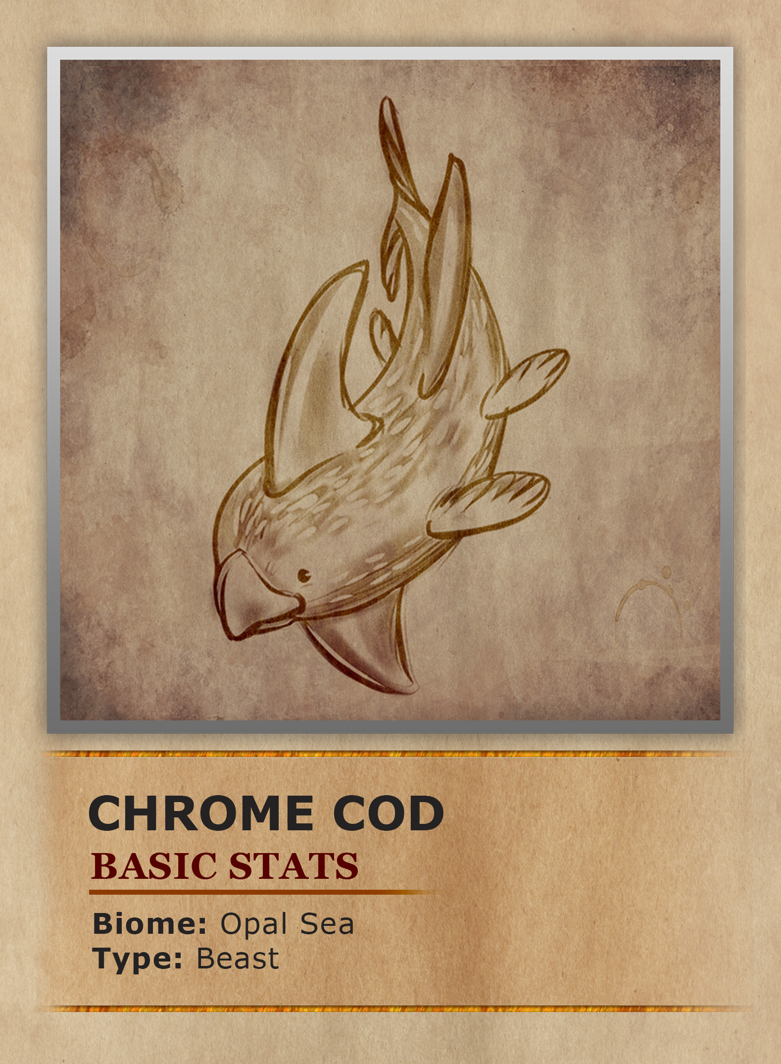 If you were to go fishing within the Opal Sea there is a good chance you might reel in a Chrome Cod. These small tasty fish have multicolored scales that seem to shimmer in the water, giving them their namesake. Their bodies have a relatively standard fish structure but with both a long dorsal fin and a matching fin under their body. This fin structure aids the fish in cutting quickly through the water. The face of a Chrome Cod ends in a birdlike beak. Although the beak is quite sharp it is not used for hunting but instead munching on coral. Typically Chrome Cod live in large schooling groups with 100s of individuals. These large groups help protect the relatively defenseless fish from hungry predators. Numbers are not their only advantage though. The scales of the Chrome Cod are excellent at bending and reflecting light. Which in the clear sunny waters of the opal sea are plentiful. The fish have learned that if a predator is getting too close they can angle their bodies to perfectly catch the sun's rays to temporarily blind the predator. This effect is magnified when in large schools, causing the predators to have a difficult time discerning where the fish are among the blinding light. Sometimes schools of Chrome Cod can get so large that when they attempt to blind a predator the light can pierce the waters surface and flash sailors.