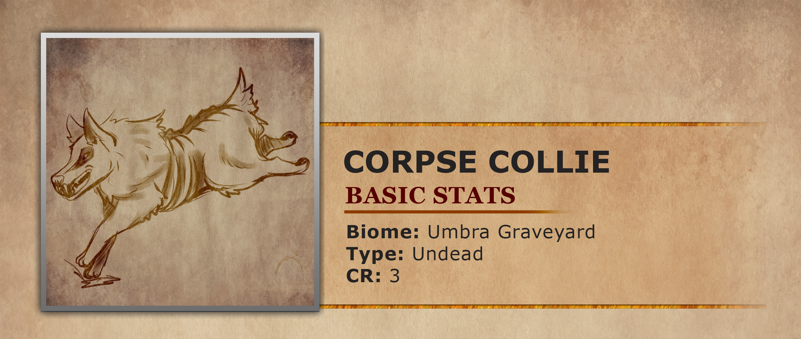 Stalking the shadows amidst the giant corpses and towering bones is a devious canine created by the god of Undeath, Viscerath. The Corpse Collie was created to patrol the Umbra Graveyard and ensure it stays as full of death as possible. That is why the Collie actively hunts creatures such as Megalo-Maggots, who break down the carrion of the graveyard. Being undead means not only does this canine not need to eat or sleep, it never gets tired. Meaning they can be constantly on the search for new victims. However, Viscerath does regularly have to make new Corpse Collies as their undead nature and constant movement eventually breaks down their rotting forms. The first thing you would notice about the Collie is its sharp fangs and snarling growl but that is not the most dangerous thing about it. The pads of its feet are actually imbued with necrotic magic that makes whatever they touch begin to rot. So a Corpse Collie could kill you simply by standing on you, as you feel your body begin to rot under its weight.