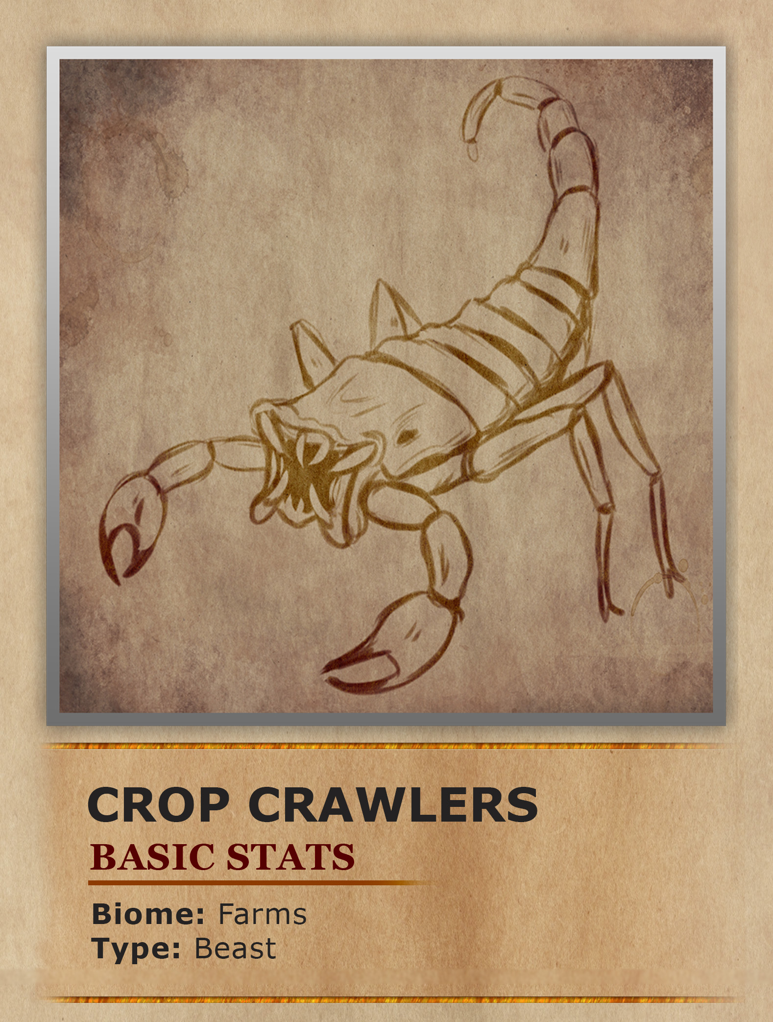 Their legs are equipped with spurs that allow them to climb stalks and vines effortlessly, and their front claws are adept at ripping apart insect prey after paralyzing them with their toxin. Occasionally, farmers may experience a bite, but the toxin only causes temporary numbness in humanoids. With their natural camouflage and predatory efficiency, Crop Crawlers are indispensable guardians of the fields, ensuring the health and prosperity of the crops they protect.