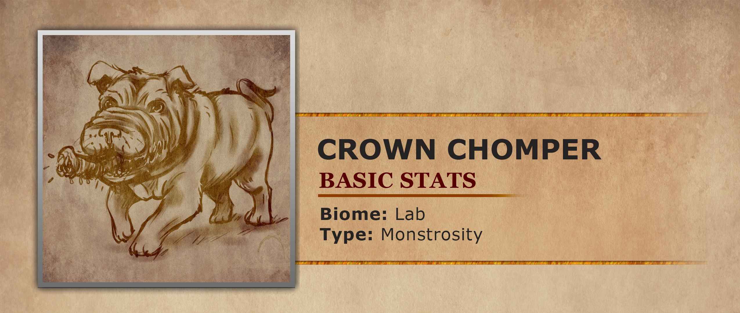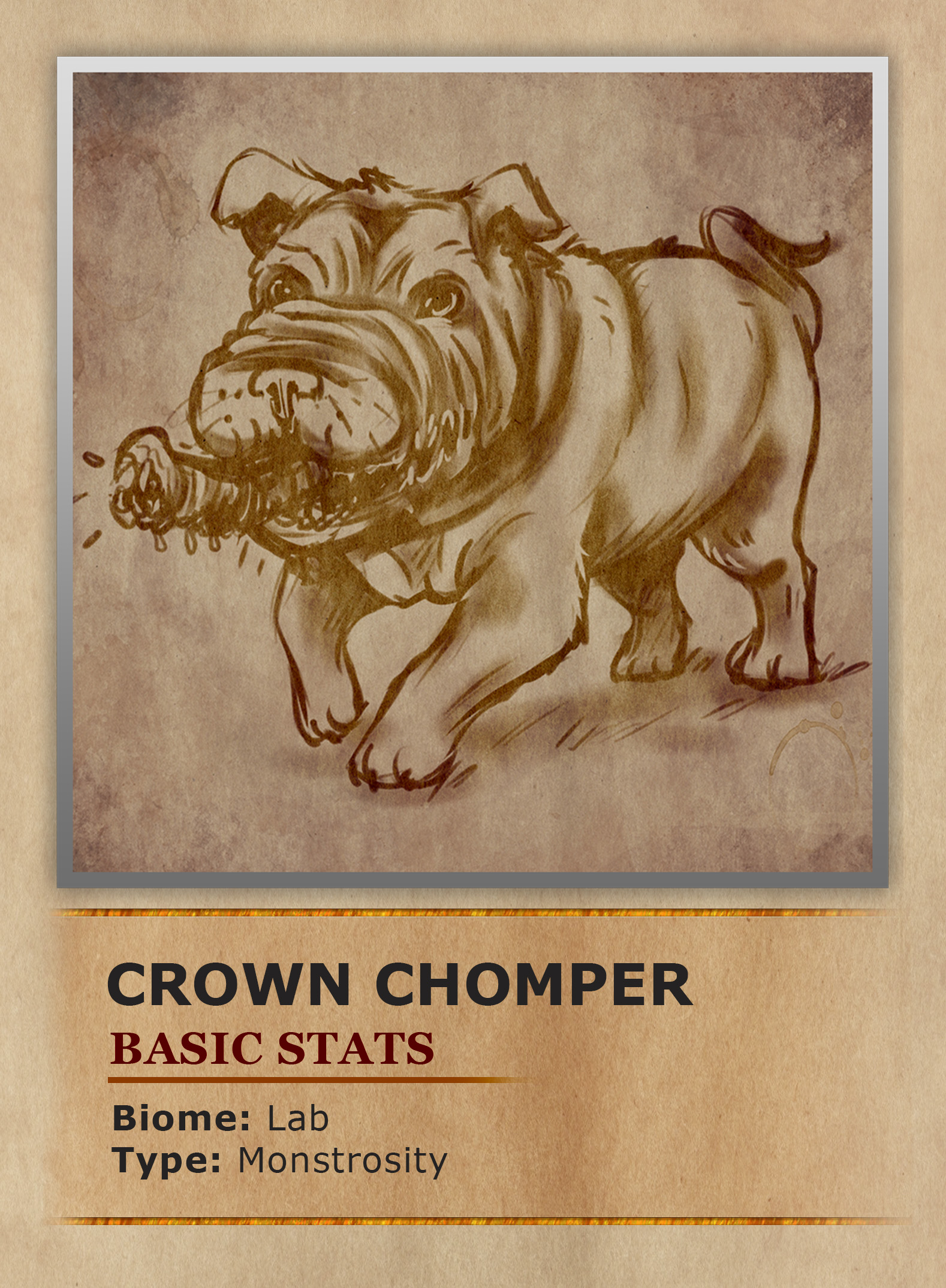 In order to garner additional support and funding from the upper echelon of society and nobility the creators of the Everlab 14 designed a special experiment. Thus the Crown Chomper was born, a lap dog sized canine that would surely impress nobility into funding the lab. While their appearance seems to be that of an unimposing small dog, they have rather unique traits. The most obvious is their jaws, which while relaxed look like a very wrinkly face. However, the wrinkles are due to the jaws ability to rapidly shoot out from their body much farther than one would assume. Not only that but their tongues seem to have a set of jaws as well. This bizarre mouth structure allows the Crown Chomper to quickly defend their owners without even needing to move their bodies. The inner jaws at the end of their tongues are even able to disrupt spells. Meaning nobility gifted a Crown Chomper need not worry about neither blade nor spell harming them. A creature such as this might seem a possible danger to even their owners but worry not. The Crown Chompers were designed with an undying loyalty for their selected masters. A Crown Chomper without a master will end up imprinting on the first humanoid figure it can find.
