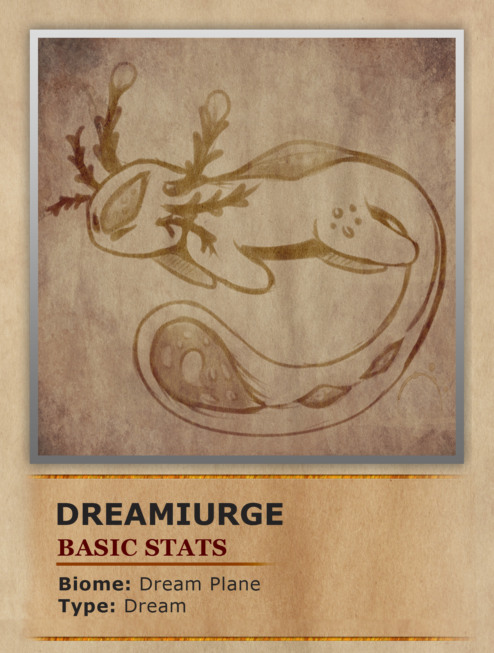A parasitic dream entity that thrives within the ethereal landscapes of the dream plane. These enigmatic creatures take on the guise of small amphibians, adorned with external gills, a tail that rivals the size of their bodies, and an array of glowing, transparent nodules. The intensity of their luminescence directly mirrors the dream essence they consume, casting an otherworldly glow upon their forms.