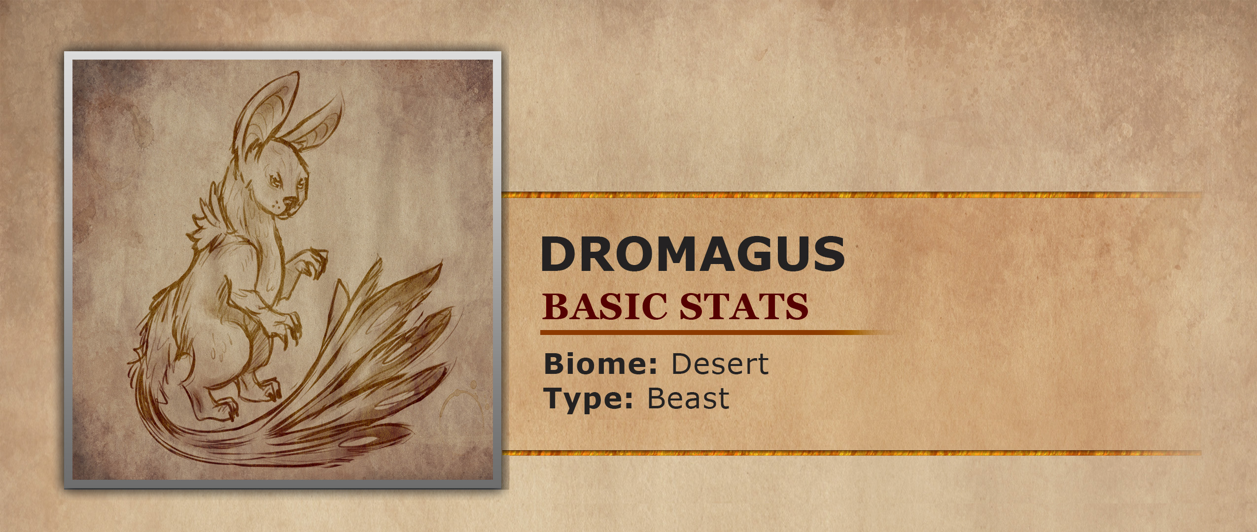 Within the Dawning Dune deserts it is a common sight to see large clay pillars overlooking the sands. While a traveler might assume these are naturally forming geographical features, natives of the land know the truth. These clay pillars are actually built by ingenious desert dwellers known as Dromagus. The Dromagus live inside these clay pillars during the day to both escape the heat and stay protected from larger desert hunters. Then as the sun sets these little hunters make their way onto the dunes. Dromagus may not be very strong but they are quick thanks to their lithe frame, long feathered tail and a set of powerful back legs. While they lack adequate night vision their large ears give them excellent hearing. This enhanced hearing allows these little hunters to locate their prey even in low light conditions. Then their speed and small size makes running down smaller prey simple. They are also very fond of eggs and will often raid larger animals' nests to make off with as many eggs as the pack can handle. Instead of communicating vocally the Dromagus communicate with each other through a series of foot thumping and tail swishes. Their tail feathers are very bright and elaborate making them perfect for display among each other and to frighten predators. If a Dromagus gets cornered they will often raise their tail behind their heads as high as it can go. In hopes of the bright colors and increase in perceived size scaring off the attacker. Although Dromagus may be smaller than desert apexes like the Desert Shifter, locals still know to be cautious when passing the clay pillars. As one never can know how many swift hunters are lurking inside.