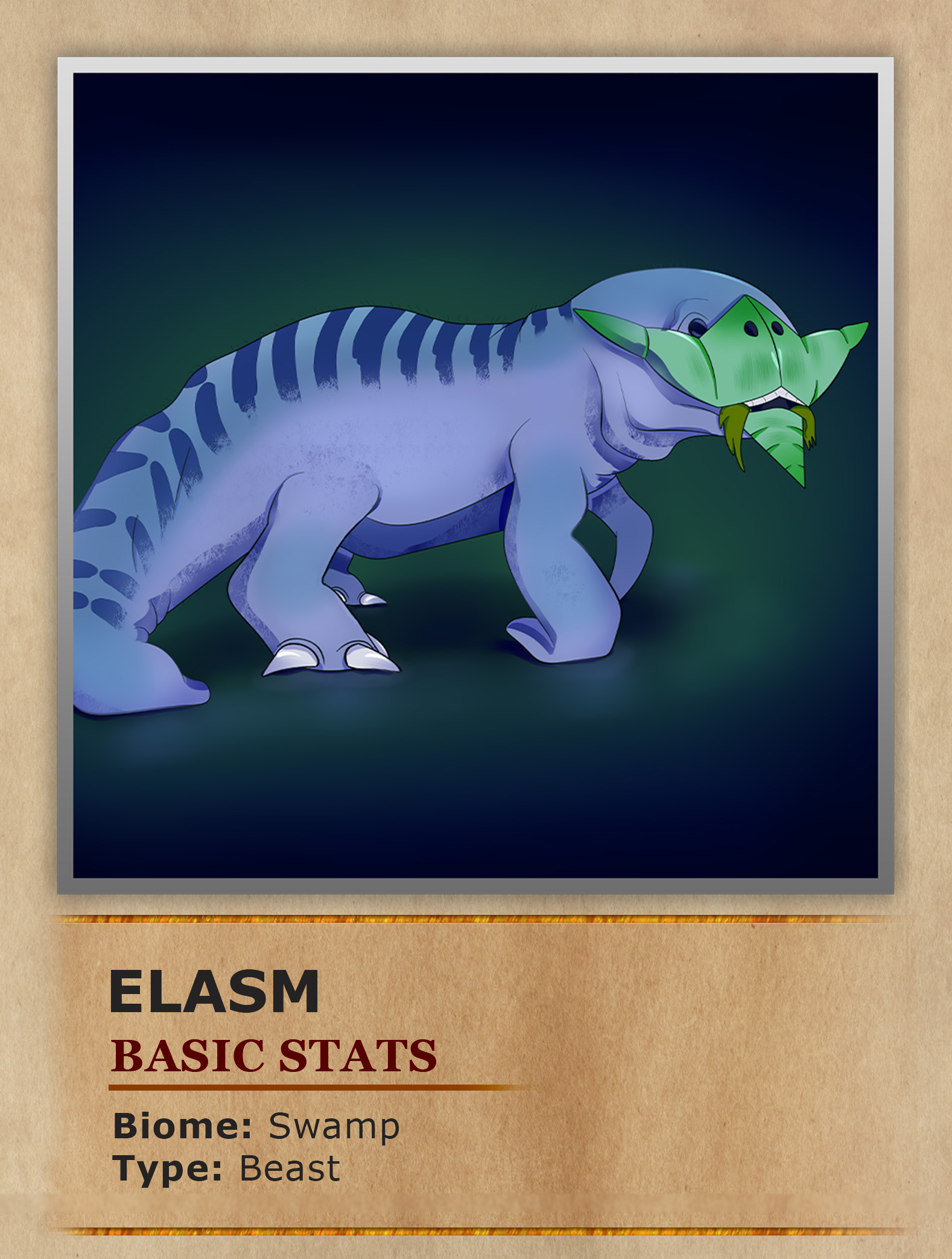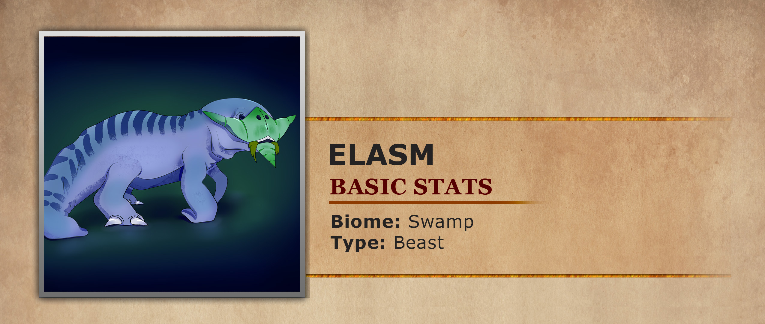 Elasm's are known for their role in shaping the swamp's waterways. Their feeding and movement patterns disrupt existing water trails and create new ones, constantly altering the swamp's landscape. Despite their size, they are peaceful and slow-moving, often providing a resting or traveling spot for smaller swamp denizens on their broad backs.