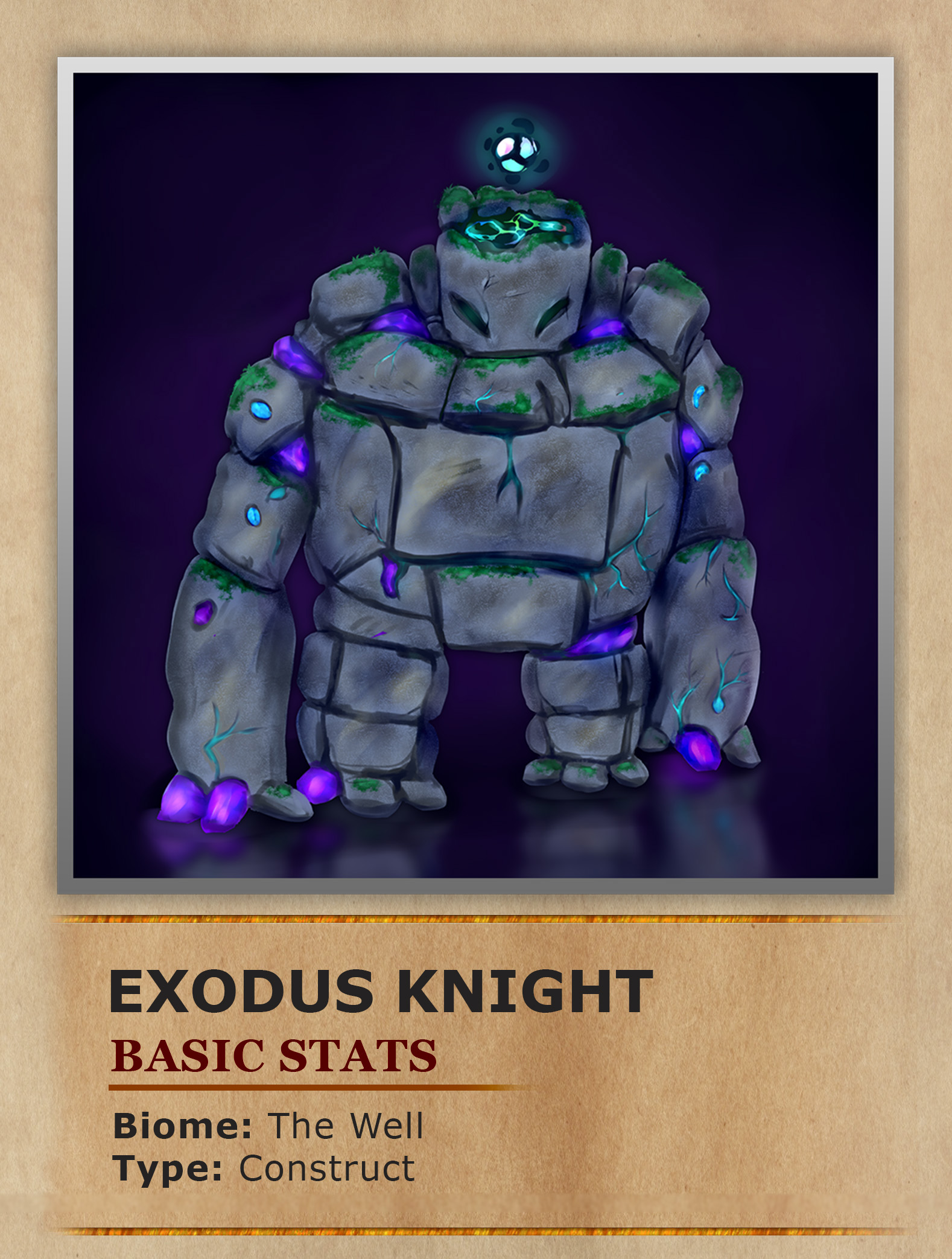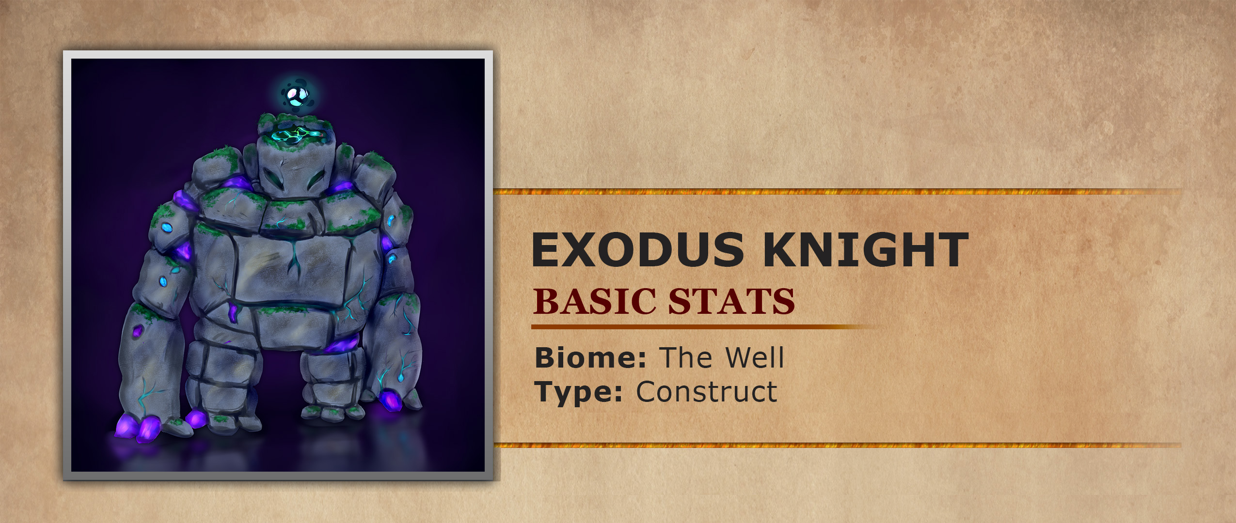 Since its creation, the Exodus Knight embarks on a nearly relentless quest through the Well, driven by an insatiable hunger to assimilate other ores into its colossal frame. Though not inherently malevolent, its single-minded fixation on arcane minerals renders it a formidable and potentially perilous entity. Miners navigating the depths of the Well often find themselves confronting these magical behemoths. When not wandering, the Exodus Knight cunningly camouflages itself amidst the rocky terrain, easily mistaken for an ordinary, inert mass of ruble and purple ore until its animating force is unleashed. Engaging in combat with these creatures proves a formidable challenge, as their stony exterior, coupled with potent magical properties, repels both conventional and magical assaults.