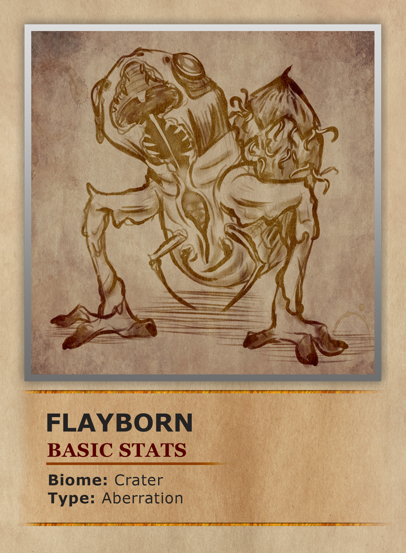 Within the confines of the Chorus Crater is a parasitic creature that is so abnormal it must be alien. This Flayborn, as they are called, start out as small worm-like animals that are implanted into a host creature through an ovipositor from its parent. Once inside a host animal the young Flayborn will slowly grow as it consumes the host from the inside. As it consumes the host, the worm's DNA also changes to mimic the DNA of its host. So while the worm eats the host its physiology begins to mimic the physical appearance of the host. Until the original host has been consumed and in its place is something much worse. At first the Flayborn will simply eat as much of the host as it can until all that is left is sagging skin. Once the parasite has fully grown into its new skin, it begins the process of making children. Sadly for the other creatures living in the crater the parasite reproduces asexually. Meaning one single individual worm could grow up to create hundreds of offspring all on its own. After the offspring are made the parasite seeks out new hosts to infect with their children, to start the process all over again. Otherwise the juvenile worms will begin consuming the parent Flayborn, if they take too long. With a creature so dangerous it was a surprise to researchers that it had not already left the confines of the crater, in search of new life forms to infect. Luckily for the rest of the world, the worm's biology has adapted to the high radioactive energy found within the crater. Therefore it cannot survive outside of the craters' border. Even so, the local researchers of the Tormek Mountains do their best to monitor this creature's population and habits while in the Crater.