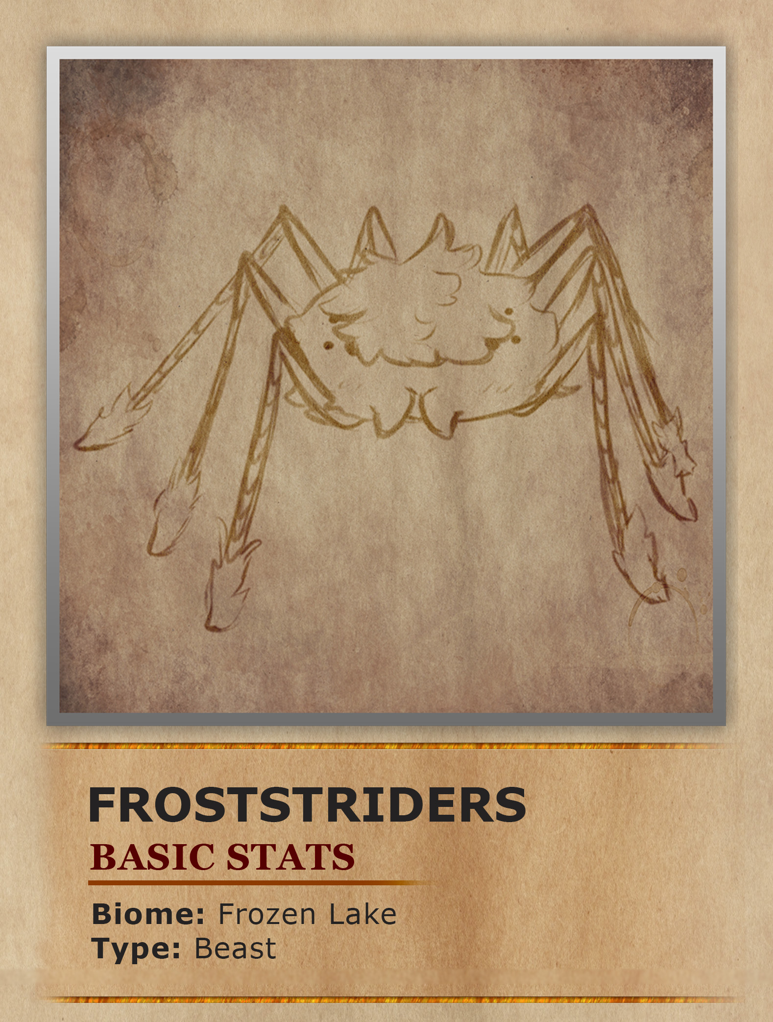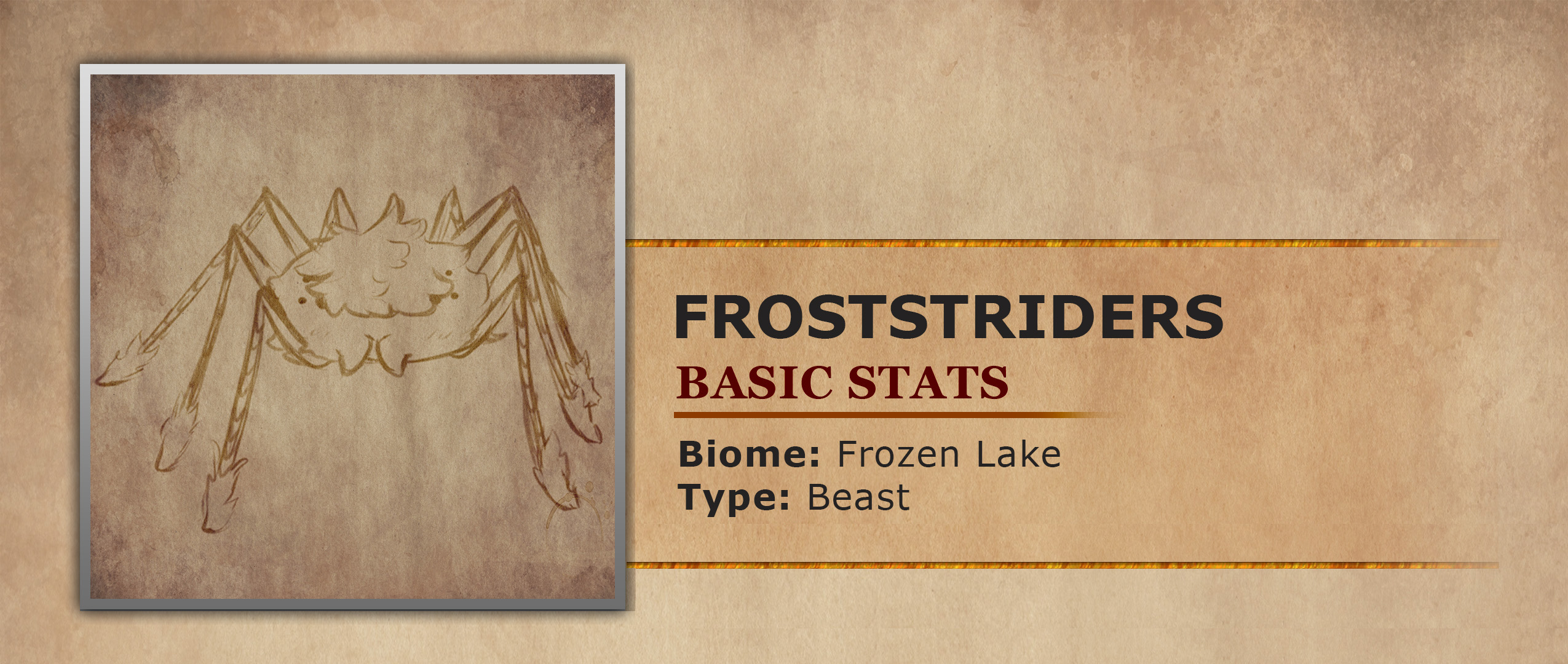 Despite their docile and skittish nature, Froststriders harbor a concealed danger within their delicate forms. Their venom, laced with crystalline ice, poses a formidable threat. Upon envenomation, it not only compromises the victim's immune system but also induces a rapid drop in body temperature. In this frigid expanse, the consequences are dire, as the chilling effects can swiftly lead to hypothermia.