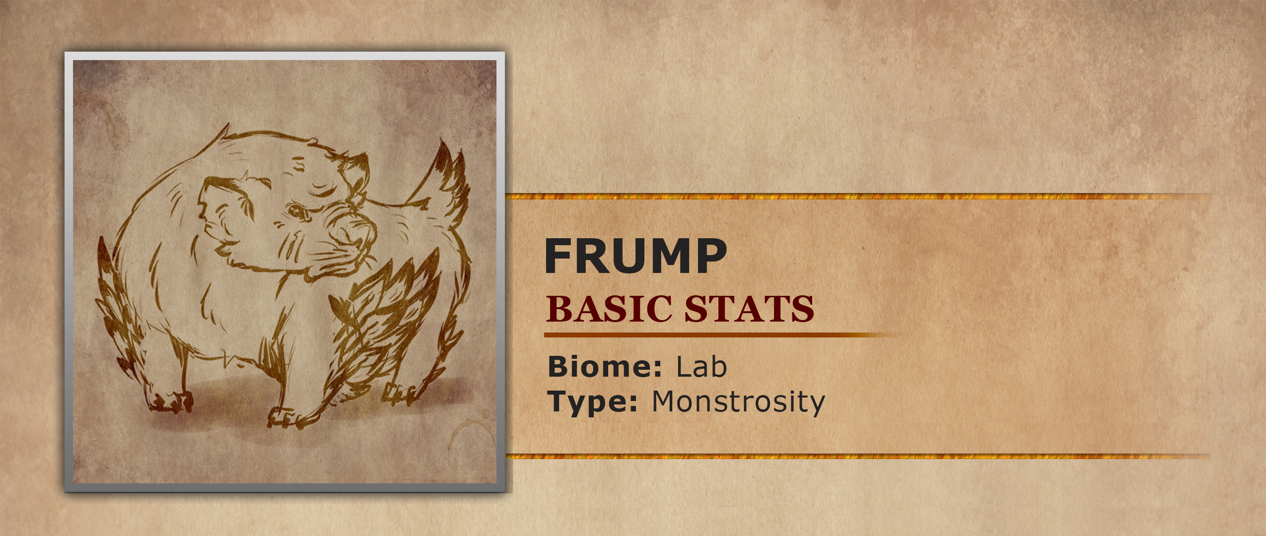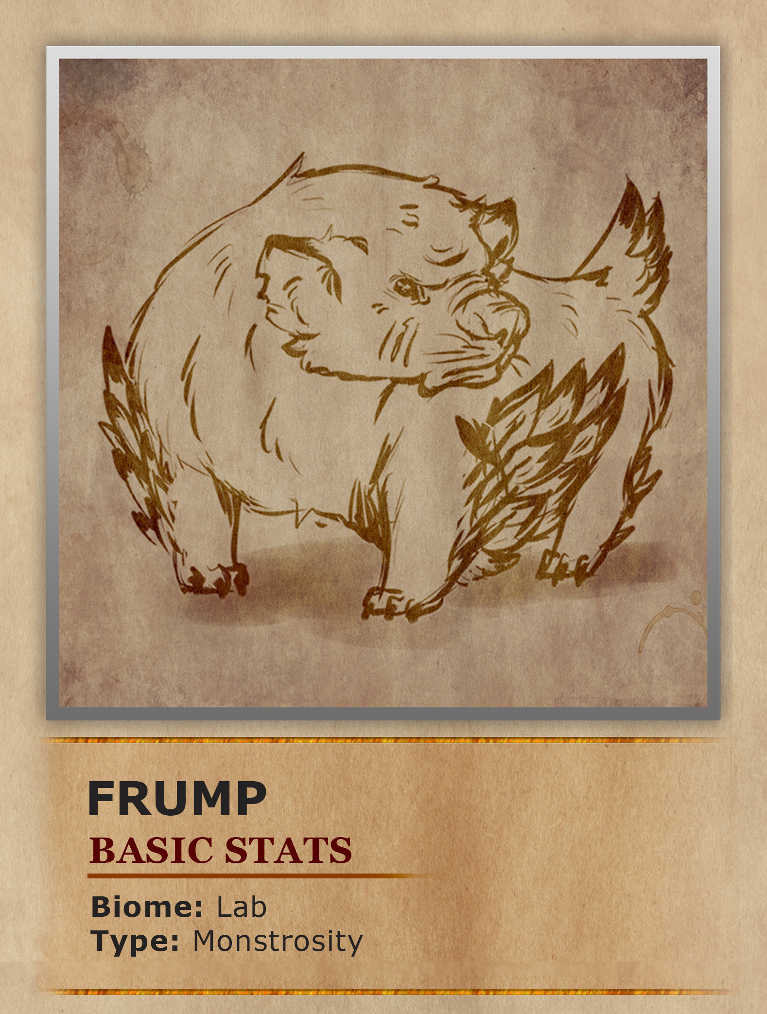 Frumps are short stocky amalgamations of bird and mammal originally bred in a secret alchemist lab far from the public's prying eyes. It is believed the minds behind the madness were looking to use these creatures to guard the lab from intruders. With its ability to both run and take flight, it would be a useful deterrent to any prying eyes. Unfortunately the alchemists designed it with so much aggression and stubbornness, not even they could command them. Even the application of control animals or charm spells had no effect on these hard headed monstrosities. Ultimately giving up on ever finding a use for the Frumps they were classified as a failure and scheduled for termination. Luckily for the Frumps the lab fell to ruin before that order could be taken out. The Frumps then escaped in large flocks into the wild where they found homes in caves and ruins.
