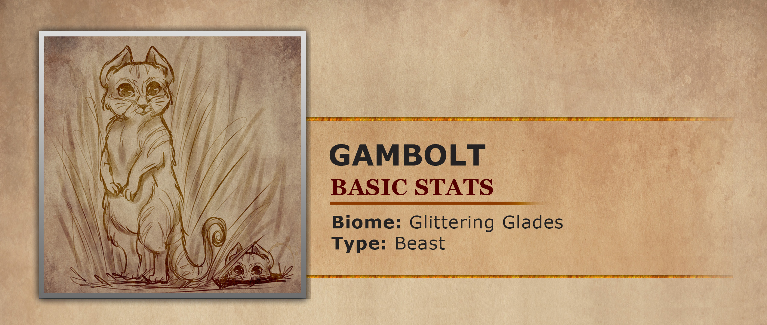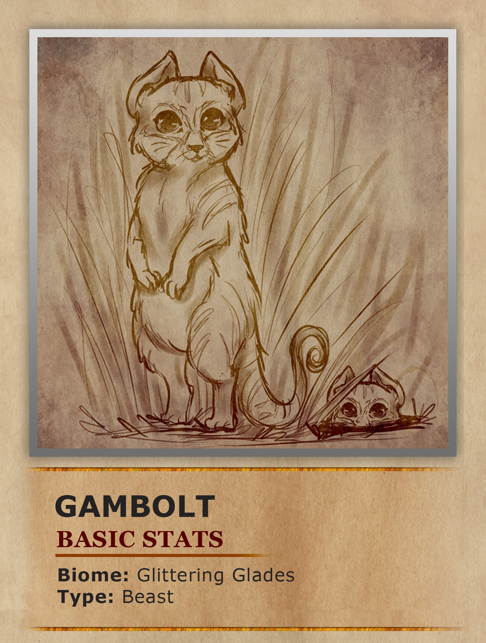 The Gambolts have a beautiful golden coat, sharp snouts, big wet noses and large eyes which they use to squint threateningly at potential dangers. Their bodies are long and thin, as are their feet. Their arms and paws are usually hanging down and cover their bellies, making them appear very shy and polite.