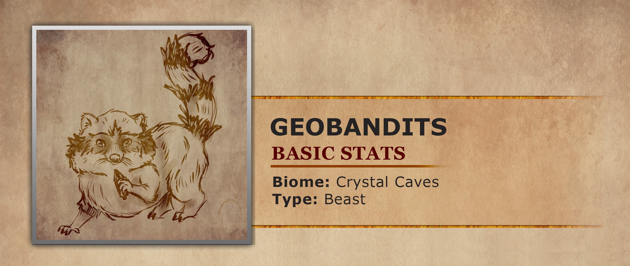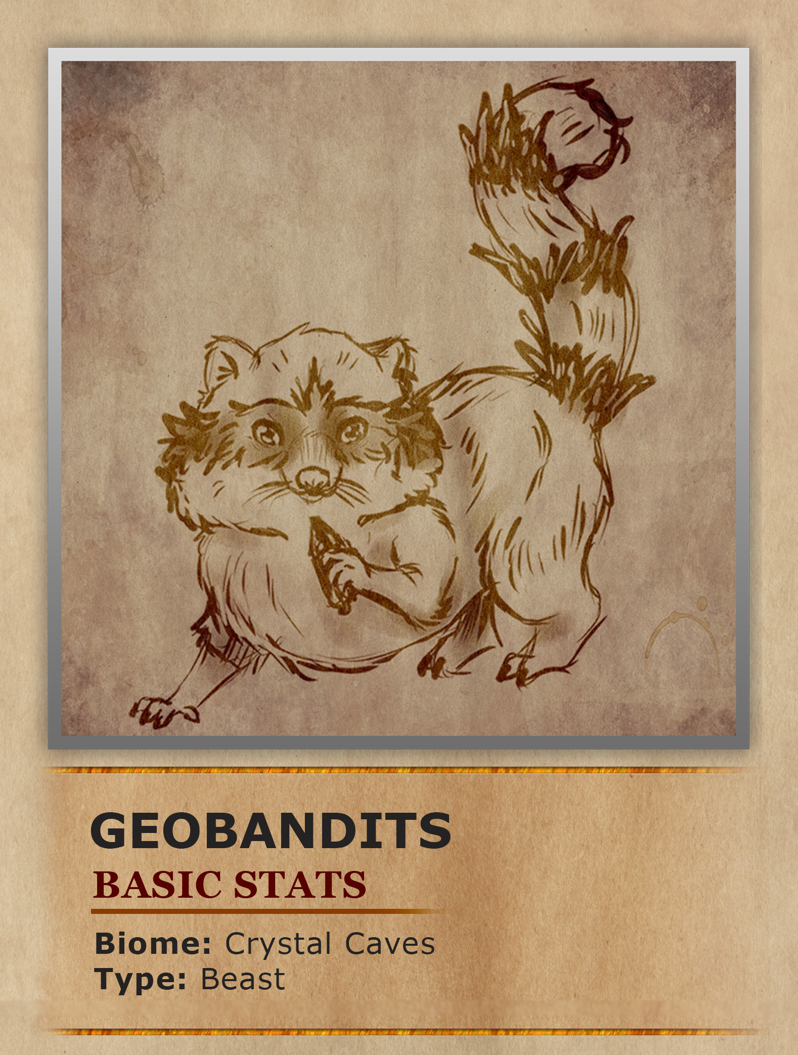 The GeoBandits are quick, agile mammals native to the Crystal Caves. Covered in thick soft fur with a color pattern on their faces resembling a mask around their eyes. These eye masks as well as the stripes of their tails are hardened onyx gemstones. While the eye masks help protect their eyes during a fight, the stripes of their tails are utilized more for offense. The stripes are able to form black needle like shards that can be launched at enemies when threatened. The fur of GeoBandits became hardened in this way thanks to their primary food source being the gemstones found throughout the crystal caverns. They manage to eat these tough gems thanks to their incredibly durable and strong fangs. Once their fangs have crunched the gems into fine powder they can easily be swallowed. Therefore allowing the GeoBandits to absorb the minerals contained within, to strengthen their fur, fangs and claws. Instead of harvesting these gems themselves, they use their natural agility to sneak up and snatch up gemstones already harvested by other creatures. Before quickly running away on their hind legs in a cute wobbly motion.They are rather friendly towards humanoids if you feed them and will sometimes return to a person who fed them a gem they wanted hoping for more. Typically dwelling in packs ranging from a family of 5 to a whole hoard of 20 working together for a common goal. These hoards sometimes cause problems to nearby mining towns. As they will organize raids, plundering the town of many of their precious gems and jewelry.