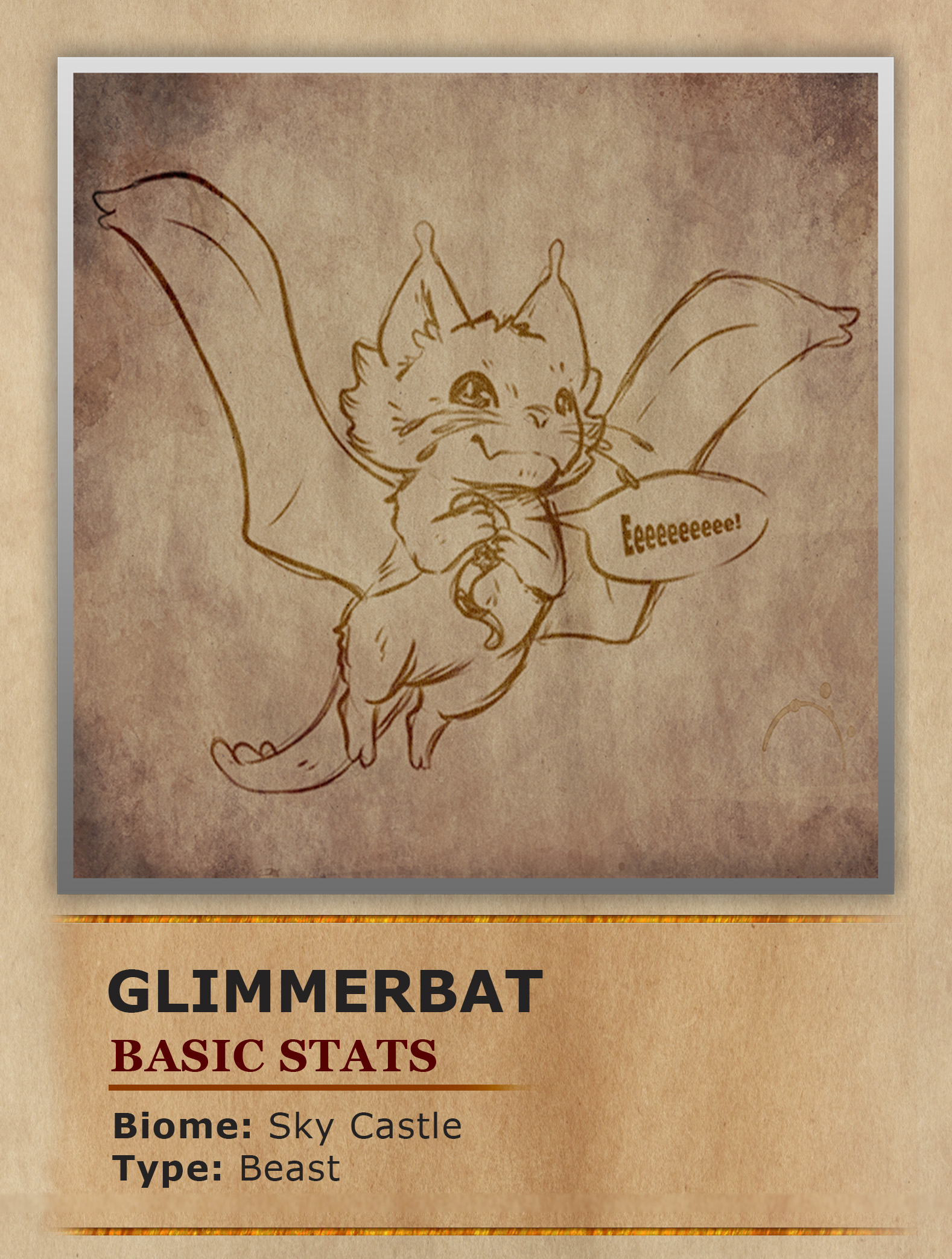 Glimmerbats are small mammals with large ears, soft fur, and leathery wings that glow an array of colors. These nocturnal creatures soar through the night skies, using their glowing patterns to communicate with their colony. Highly social, they roost in tall towers and cliffs, clinging to surfaces with their prehensile tails, which end in hand-like grips. At dusk, Glimmerbats emerge to feed on insects like Slithers, their radiant wings illuminating the evening sky. Unlike their relatives, the Angluna, the Glimmerbats' bioluminescence is a direct result of their Slither-based diet, as younger individuals who haven’t yet fed on Slithers display no such glow.
