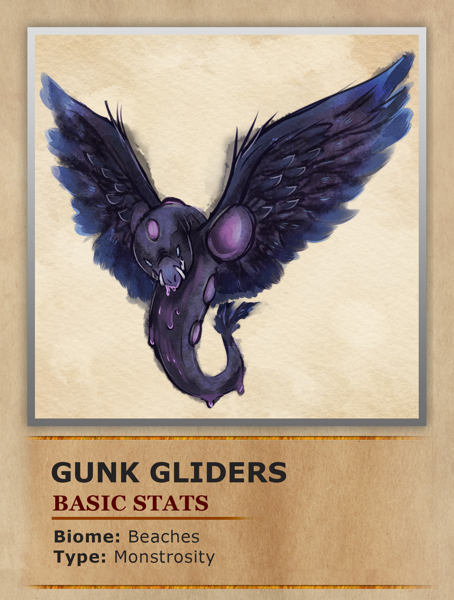 Most fish spend their entire lives in the safety of the water but Gunk Gliders are different. These fish possess elongated bodies sporting a pair of bird-like pseudo wings. While superficially resembling bird wings, they are actually modified fins that act in a similar fashion to wings. However, these pseudo wings are not perfect for flight. To make up for their inadequacies, the Gunk Gliders possess inflatable air sacs right beneath their wings to give them an extra boost or lift. Gliders can be found in great numbers around most beaches and coastal towns. Despite their large numbers, they are rarely hunted by either humanoids or larger predators. This is mostly due to their bodies being covered in a thick mucousy slime. Their slime helps to keep their bodies moist while out of the water and gives them an unpleasant taste. Gliders spend their days either soaking in shallow waters or hunting for food. While hunting the Glides use a mix of electrical fields to stun prey that get within a certain range. Then they tear into the unlucky stunned prey with their sharp beaks and tusks. However, in recent years Gunk Gliders have become used to scavenging off of the food and trash produced by humanoids more so than hunting for themselves. Making them seen as a common nuisance for these towns.
