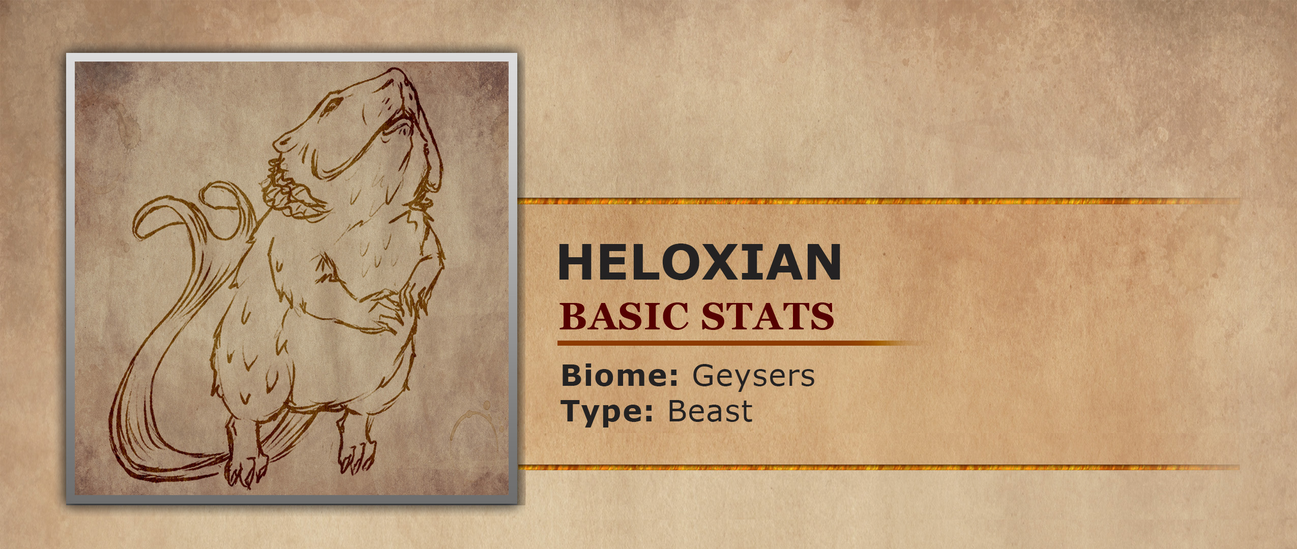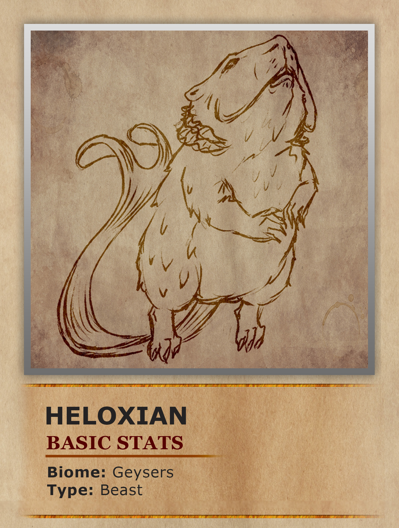 Within the tide pools surrounding geysers live strange aquatic inhabitants who superficially resemble rodents but are in fact fish. Even their hair is actually just modified scales that give them a more furry appearance from a distance but upon closer inspection they even have a pair of external gills around their necks. Despite this their most unique feature is actually a heat producing organ that raises the temperature of any water source they find themselves in. This along with their water breathing limitations means they can never venture out of the safety of the water. As the water acts as a counterbalance to the excessive heat produced from their special organs. Therefore without the water the Heloxian would die of heat stroke long before succumbing to suffocation. The Heloxians live in large groups of up to 10 individuals in order to protect themselves from predators like the Melters Maw. If a Heloxian is ever threatened, they will expand their large cheek pouches in an attempt to appear larger. Interestingly this technique has also been seen during mating and territorial disputes between males. Whenever their tide pools start to become too cramped, the Heloxians take turns using their long paddlelike tails to widen the confines of the pools. These odd fish are often hunted for their heat producing organ to use in fire related alchemical potions. Other times they are captured alive and relocated to resorts to create artificial hot springs.