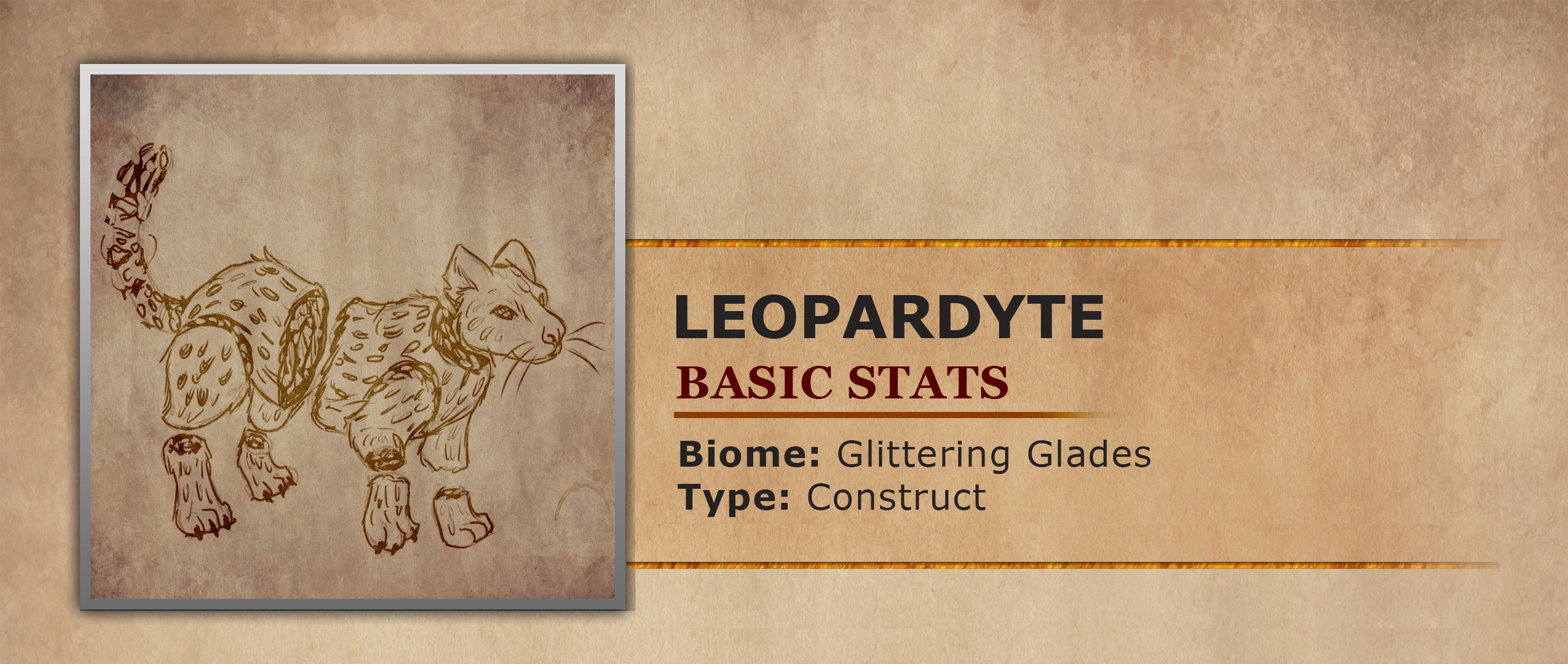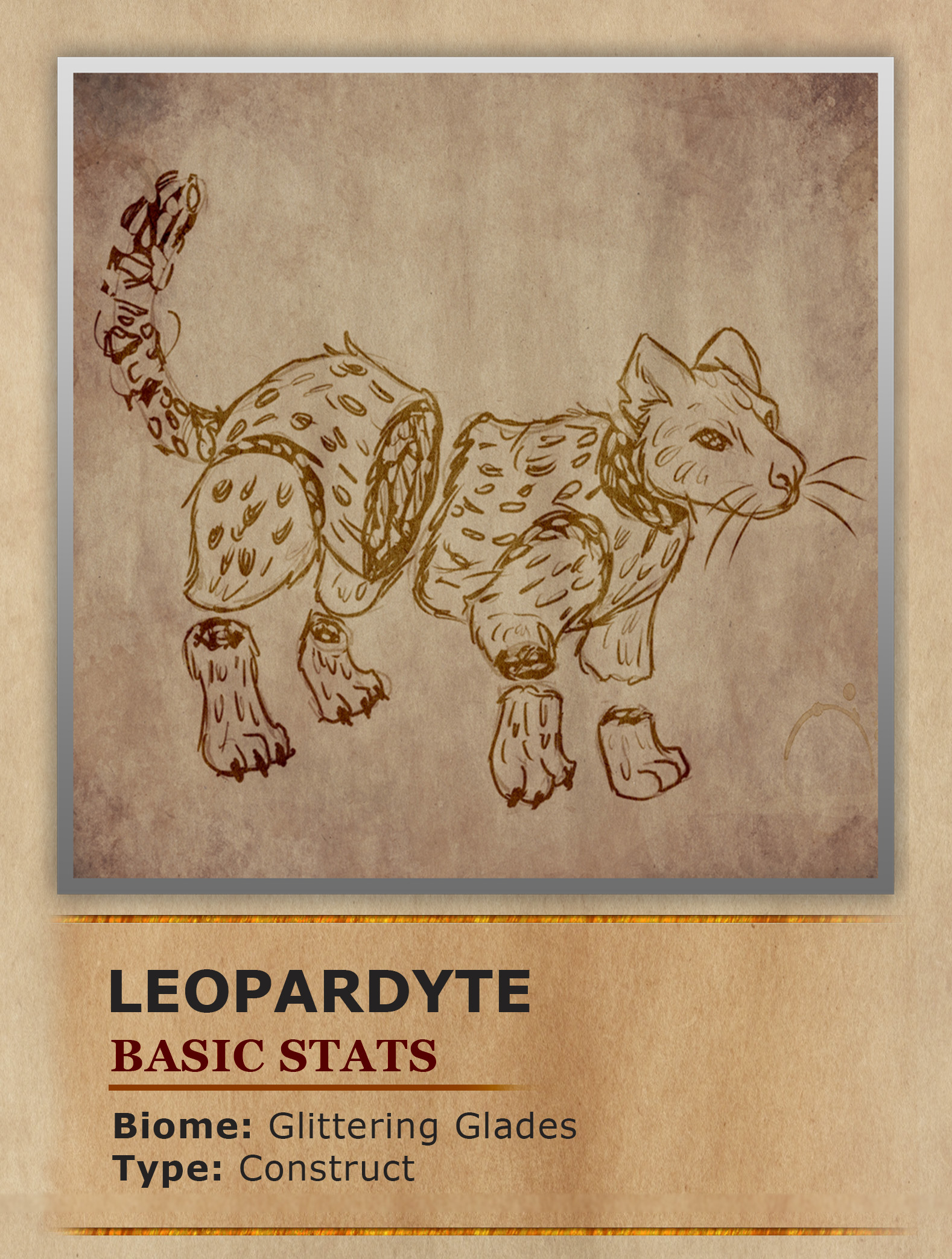 Stalking the Glittering Glades is a strange creature, not one composed of flesh but of stone. Its shape is vaguely feline but made of segmented geodes that seem to be held together by magic or magnetism. Unlike a living animal the Leopardyte does not hunt for food but rather stalks its territory looking for trespassers. Legends say the first Leopardyte was created by a Wizard who wanted to make a magical companion for their child. After an unfortunate accident their child was lost, and in the wizards grief they continued to make the geode companions in order to have some part of their lost love continue to exist in the world. Now the wizard is believed long gone but their creations continue to guard the grasslands to this day.