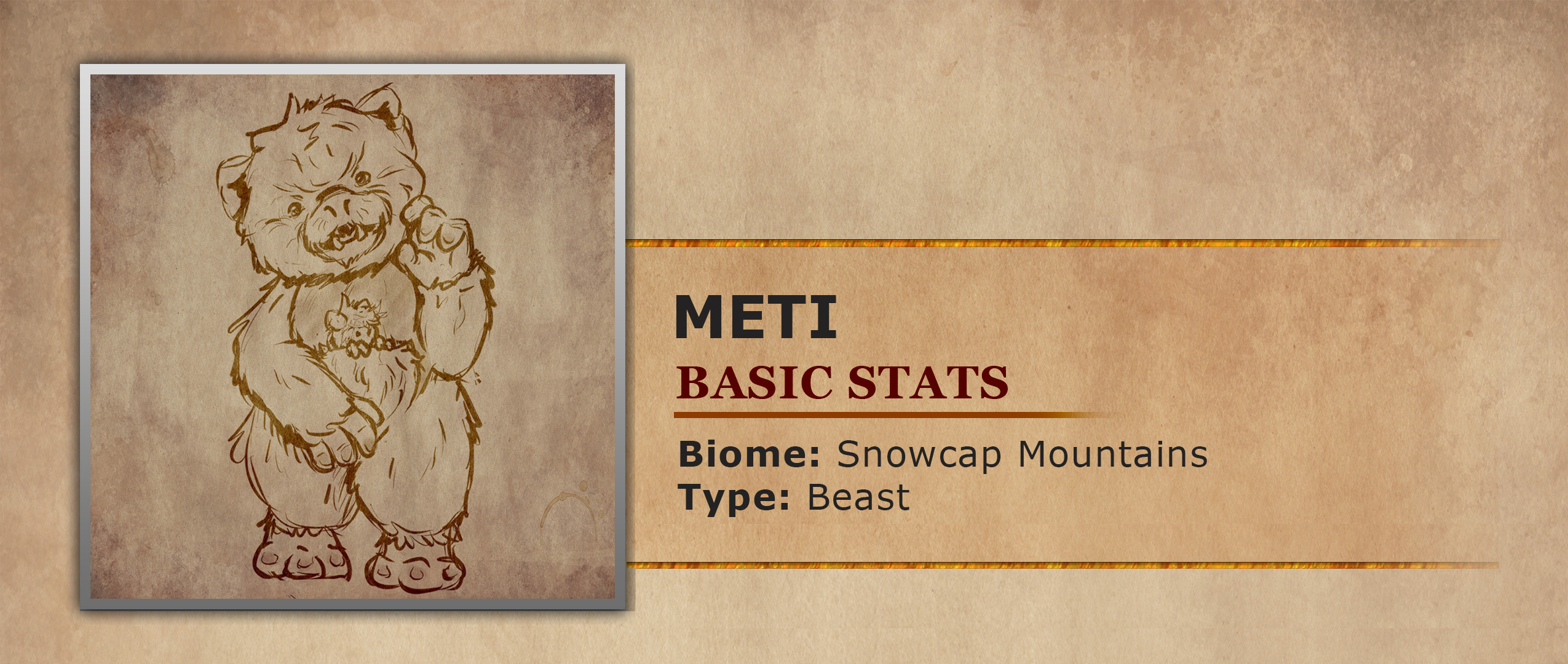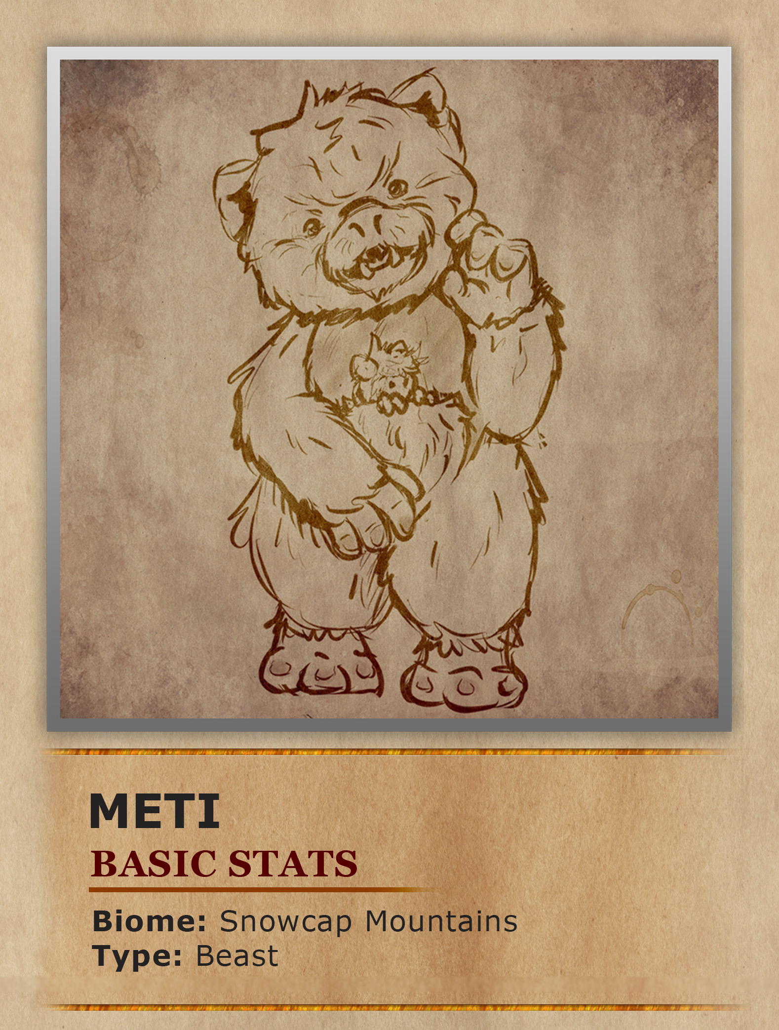While traversing the freezing snowcap peaks of the Tormek Mountains you might encounter what at first appears to be a group of small humanoids wearing a furry coat. As you get closer you see they are not humanoids after all but some kind of primate with matted white fur, and light blue bellies. These creatures are known as Meti’s and are quite common in these high altitudes. While not very dangerous they know how to utilize their loud yells and acoustics of the mountains to scare off predators. If that doesn't work they attempt to make themselves look more intimidating, by raising up their arms to appear larger. Unfortunately for the Meti this intimidation tactic can often look more cute than scary. Luckily for the Meti their social tendencies mean not only can they take turns looking out for predators but can also take shifts gathering food and looking after young. Looking after their young is aided by the pouches on their stomachs, which act as the babies home for the first year of life. This pouch not only keeps them insulated from the cold but helps the parents keep an eye on them. The babies will even try to help in the parents intimidation tactic, by also raising up their tiny arms out of the parents pouch. However, this just adds even more of the cuteness factor to these furry survivors.