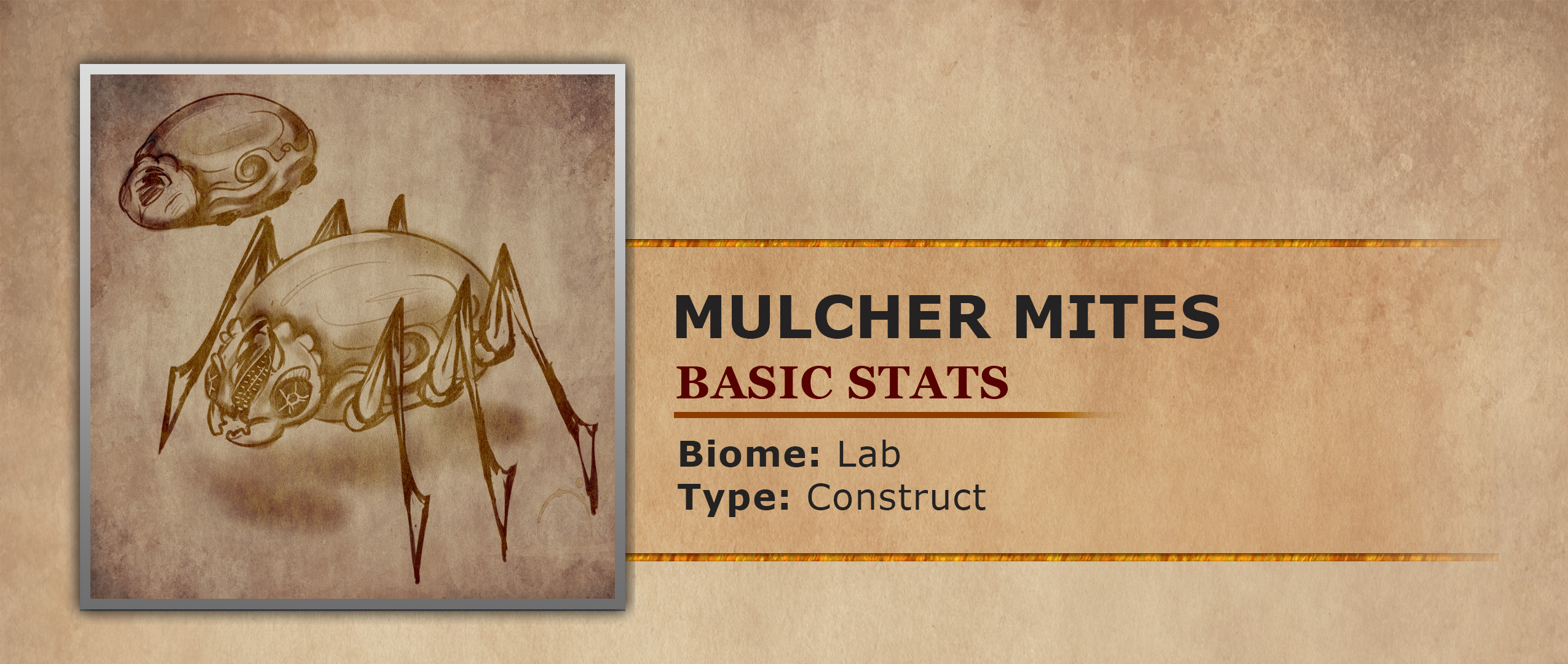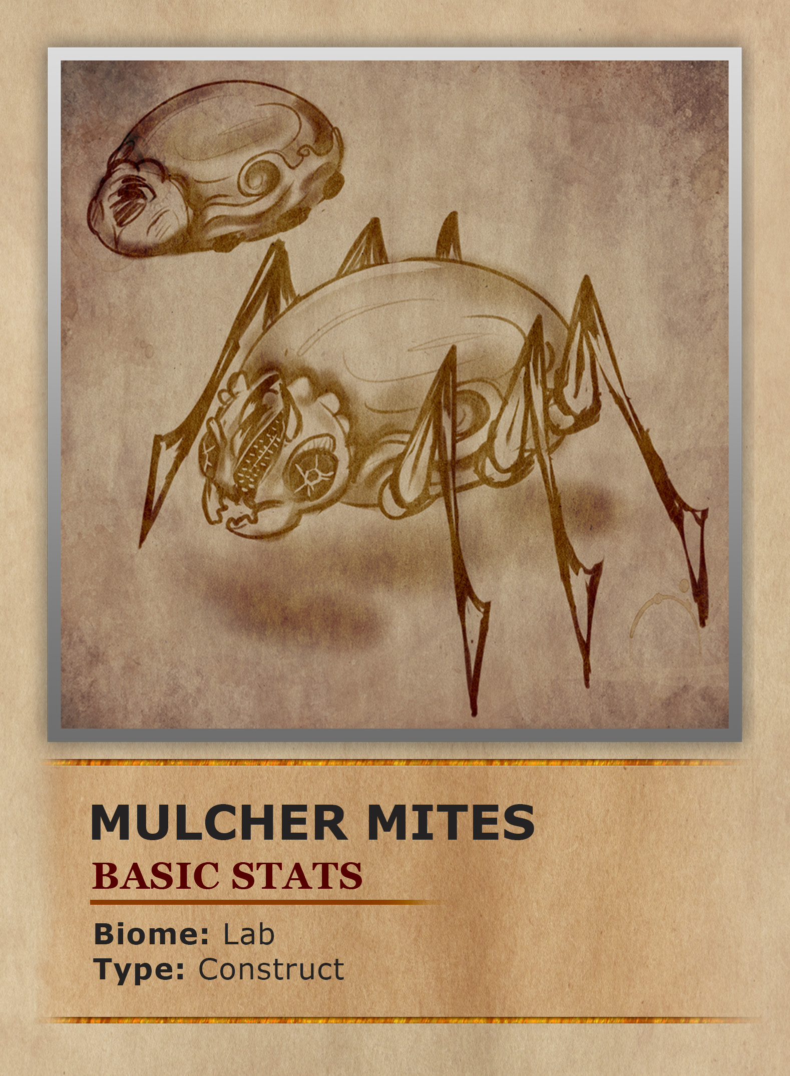 Mulching Mites: Mulching Mites are small constructs roughly the size of a small stone, though their dense composition makes them far heavier than their dimensions suggest. At rest they resemble decorative metal jewelry fragments, often lying in clusters across ruined floors. When active, the shell separates along invisible seams and unfolds into a six-legged predator-scavenger form. Their legs extend on rounded ball joints at the hip and knee, giving them spiderlike articulation and swift directional control. Each limb ends in a narrow blade-like foot able to grip stone, slice roots, or anchor to walls. Three frontal horns rise above the mouth and curve inward like the claws of a mechanical grappler. They use these appendages to lift debris, carry harvested matter, or pin struggling prey. Though tiny alone, a coordinated mass of mites can move objects far larger than themselves by hooking and dragging in unison. Mulching Mites were originally created in the laboratories of the abandoned Thunderstep Island, where alchemists and artificers pursued strange experimental ideas. Archived records name them Experiment C-3467. Their intended purpose was humble: to consume organic waste and convert it into nutrient-rich fertilizer for farms across the country. They were meant to be tireless laborers, not predators. Notes recovered from auxiliary archives mention adaptive digestion matrices, autonomous swarm intelligence, and self-propagation protocols. Whether these additions were ambition, desperation, or sabotage remains unknown. What is certain is that the mites ceased obeying limits placed upon them. Their grinders began processing wood, leather, stone, flesh, and eventually nearly any material not magically reinforced.