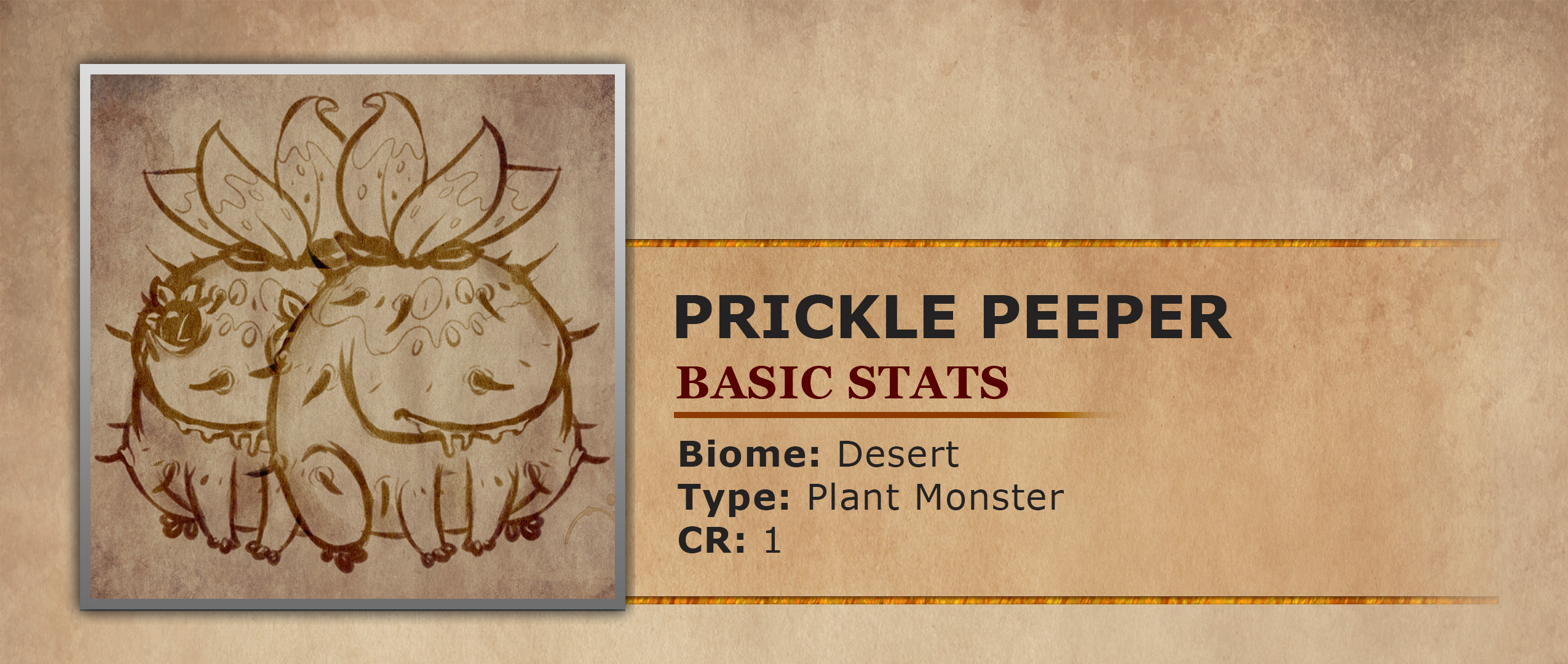 Prickle Peepers are round plant monsters that inhabit the desert regions of Crius. These ambush hunters resemble cacti but with wide mouths and short stubby limbs. Generally solitary creatures the Peepers will spend their days mostly buried in sand completely motionless waiting for the sun to set to begin the hunt for prey. Their hunting strategy involves them simply waiting for prey to walk on by to swallow them whole. Unfortunately for them if they happen to miss the initial strike their clumsiness will make it easy for their prey to escape. While they may at first appear to be blind, they actually possess a pair of large eyes that they simply keep hidden during the daytime hours. It is believed they do this to avoid the bright sun harming their sensitive eyes and because having such large eyes would make their camouflage less effective. As they are not the largest or strongest of the predators lurking in the desert this camouflage is there to both help them hunt and avoid being hunted. Luckily if they are spotted the Peepers are covered in sharp venomous thorns, that will make most predators think twice before taking a bite.