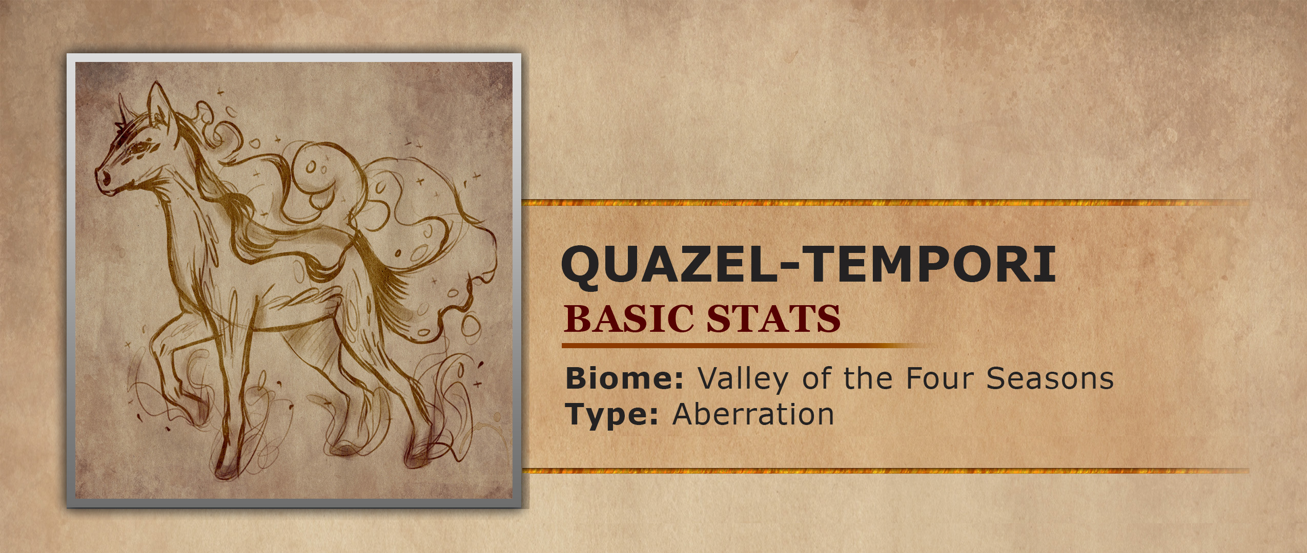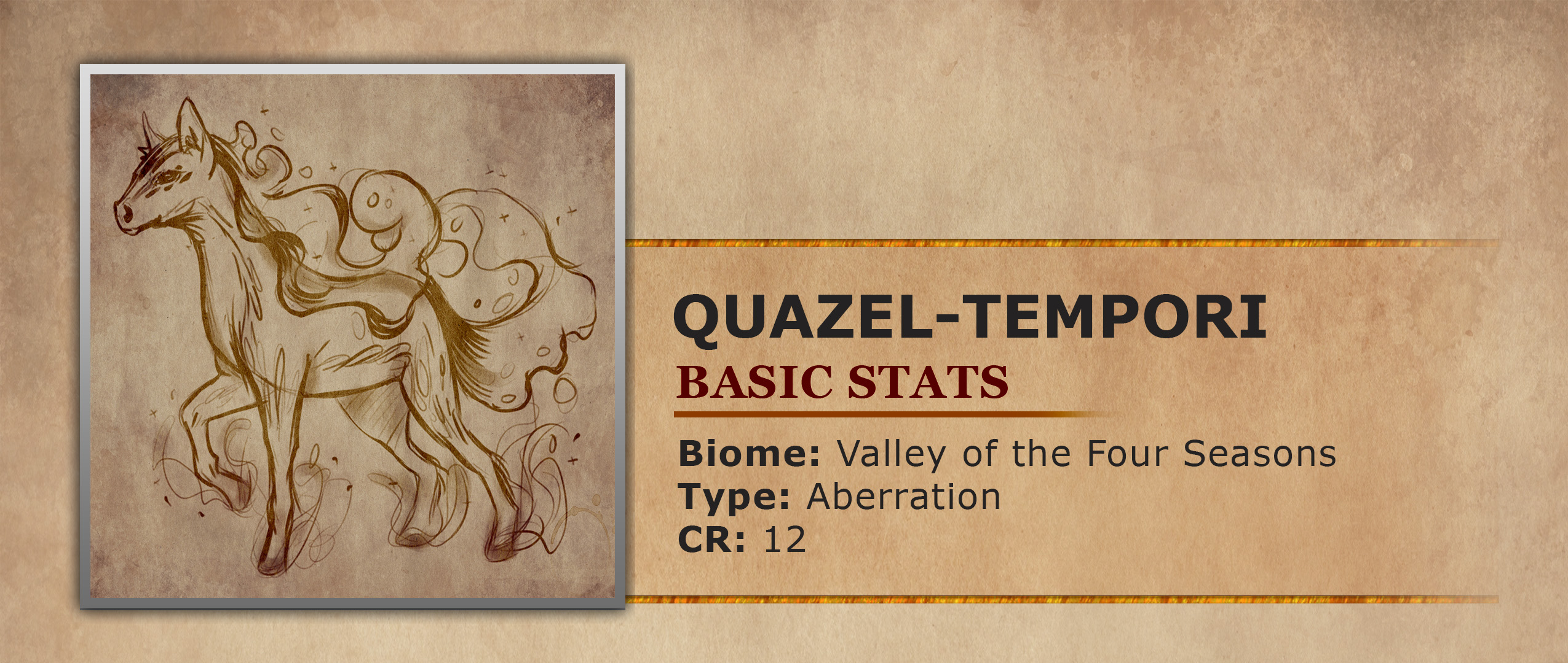 This mysterious creature is often thought to be a magical construct, because of how strange and seemingly unnatural its appearance and behaviour is. But in fact, the Quazel-Tempori appeared long ago from a place far far away from the small world of Crius. The Quazel-Tempori travelled through the void visiting planet after planet, and when it touched down in the Valley of Four Seasons it immediately knew it had found its home. This creature can exist in all states of matter, solid, liquid, gaseous and slime. A little known fact however is that the Quazel-Tempori selects this form based on its environment needs. In cold environments the Quazel-Tempori becomes solid, in warm it becomes gaseous, in temperate it becomes slime and in wet environments it becomes liquid. Rumor has it that the Quazel-Tempori even has a secret fifth form. During rare cosmological events like planetary alignments, blood moons, meteor showers etc the Quazel-Tempori takes on a transient, ethereal form where it is both tangible and intangible. Its body will reflect the starry sky, and show the cosmos which it once called home before its arrival in Crius. During this form it has the appearance of a spectral horse that can be seen looking up at the night sky, seemingly looking for something it lost along the way. An elusive creature it is considered a rare and beautiful sight to catch a glimpse of these majestic travelers, in whichever form they take.