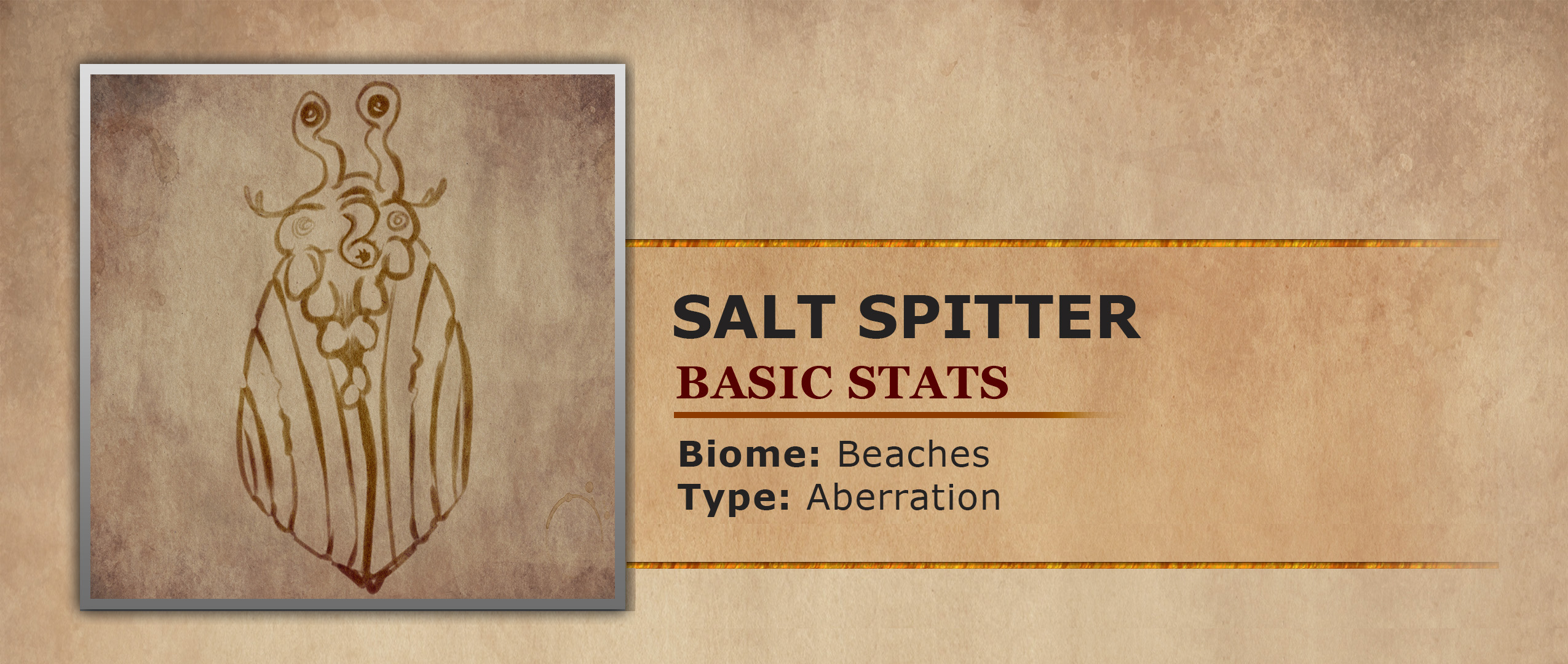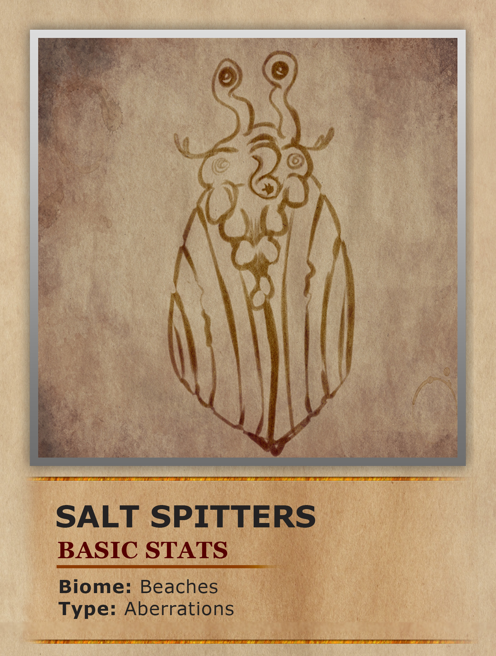 Salt Spitters are small aquatic aberrations, measuring only a few inches in length, commonly found along the shores and shallows of Crius beaches. Their bodies are soft and squishy, equipped with two pairs of eye stalks and stubby suction cup legs. These legs are crucial for maintaining their protective keratin shells. When threatened, Salt Spitters can expel a concentrated blast of salt water, typically targeting the eyes of predators before retreating back inside their hard shells. Despite their surprising intelligence for an animal, they are considered a culinary delicacy among the coastal inhabitants of Crius, who often seek them out for their unique flavor.