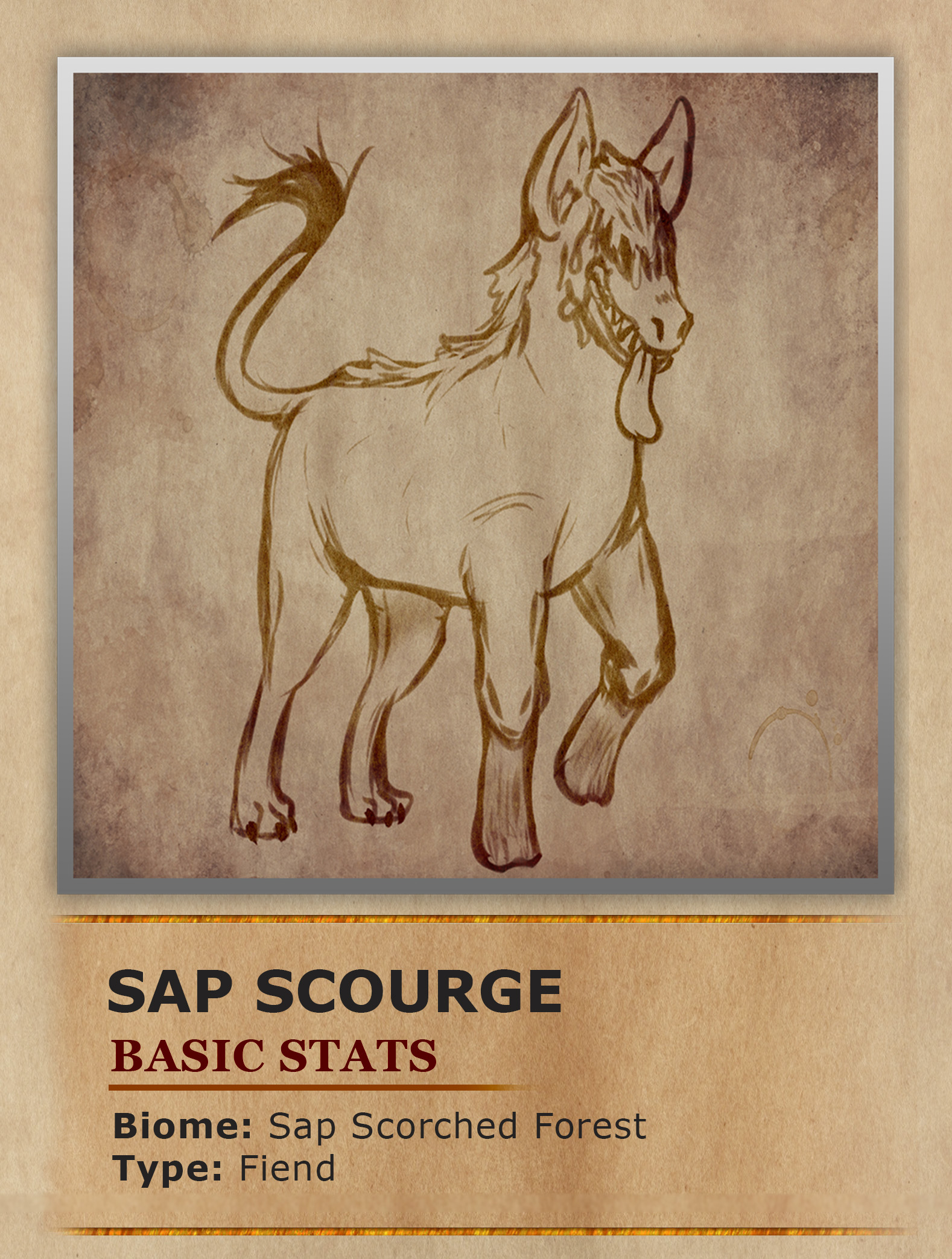The Sap Scourge is a corrupted equine monster that stalks the Sap Scorched Forest. Legend says that the Sap Scourge was once a Sprite Steed fey that ended up losing their prized magical orb. Without the orb the Steed was cut off from the Twilite Drift and cursed to wander the Sap Scorched Forest forever, becoming eventually corrupted by the Forest. It is still debated if this creature truly exists, as sightings are very rare and usually come from frightened locals or old ghost stories. If the stories are to be believed the Scourge has a strong muscular frame, a mouth full of sharp teeth, reinforced front hooves and a face bubbling with acidic sap. The creature is blind as the sap completely covers the beast's eyes, if it had any to begin with. Meaning it chooses to stalk the forest at night in search of Sprite Steeds, utilizing its excellent hearing and smell instead of eyesight. It is believed that the Scourge hunts Sprite Steeds in an attempt to reclaim its lost orb but can’t seem to find the right match. The Scourges nighttime hunting is why locals of the area warn travelers not to go into the forest at night time or risk the Scourge's wrath.