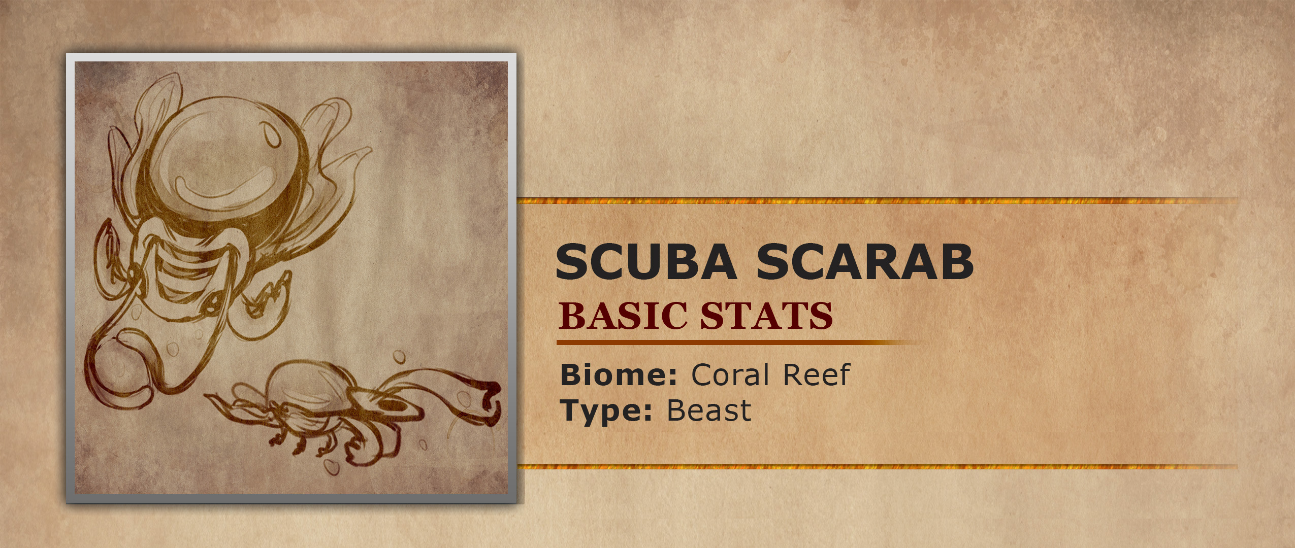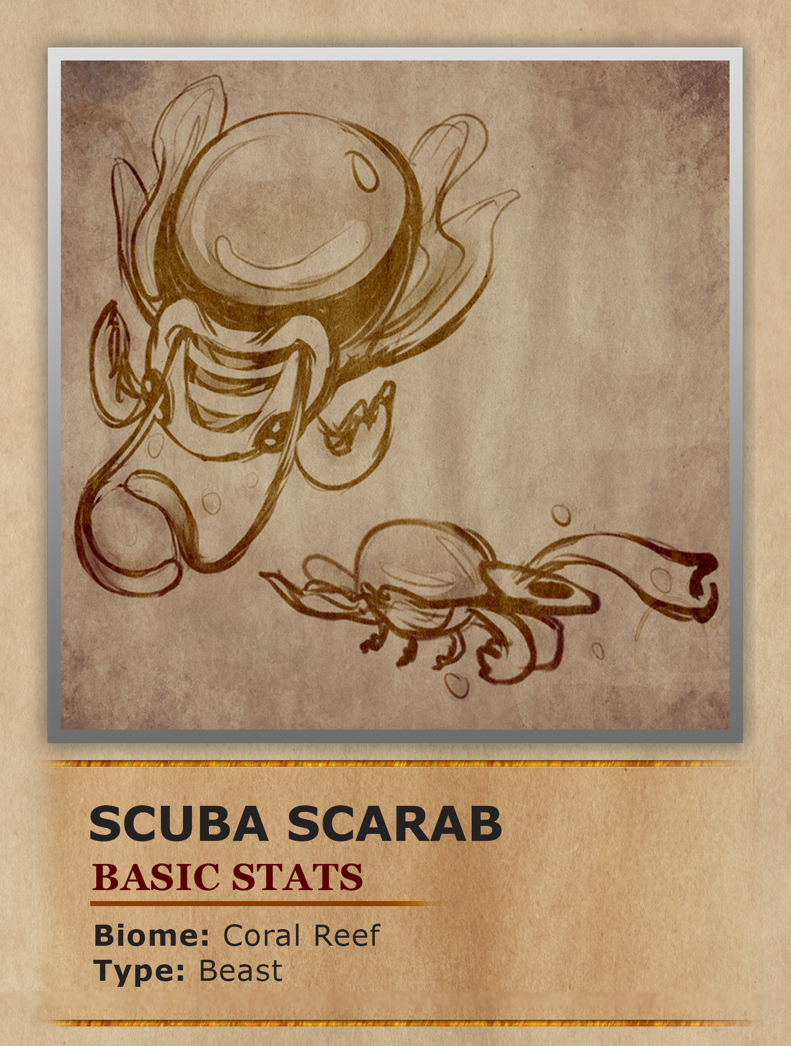 When looking at the beauty of the coral reefs one could almost miss its smallest resident. Hiding there inside air bubbles rising to the surface, is a beetle. Not just any beetle but a beetle specifically adapted to surviving in the ocean, the Scuba Scarab. These Scarabs have an iridescent light blue shell and round body. Under its shell its wings are thicker and more membranous than a normal beetle, with fin-like edges, to help propel it through the water as well as fly short distances. These beetles not only use bubbles as sanctuary below the waves but also as a form of defense and travel. The antennae of Scuba Scarabs are able to form and manipulate bubbles. In this way they can create a stream of bubbles to either speed their swimming or help mask their escape. Oftentimes these beetles will form bubbles near the ocean floor, attaching them to coral to keep them from floating away. They are also able to unanchor these bubbles quickly in order to quickly send the bubbles to the ocean surface.