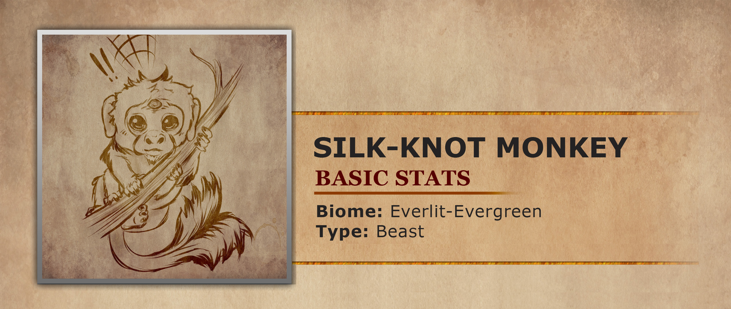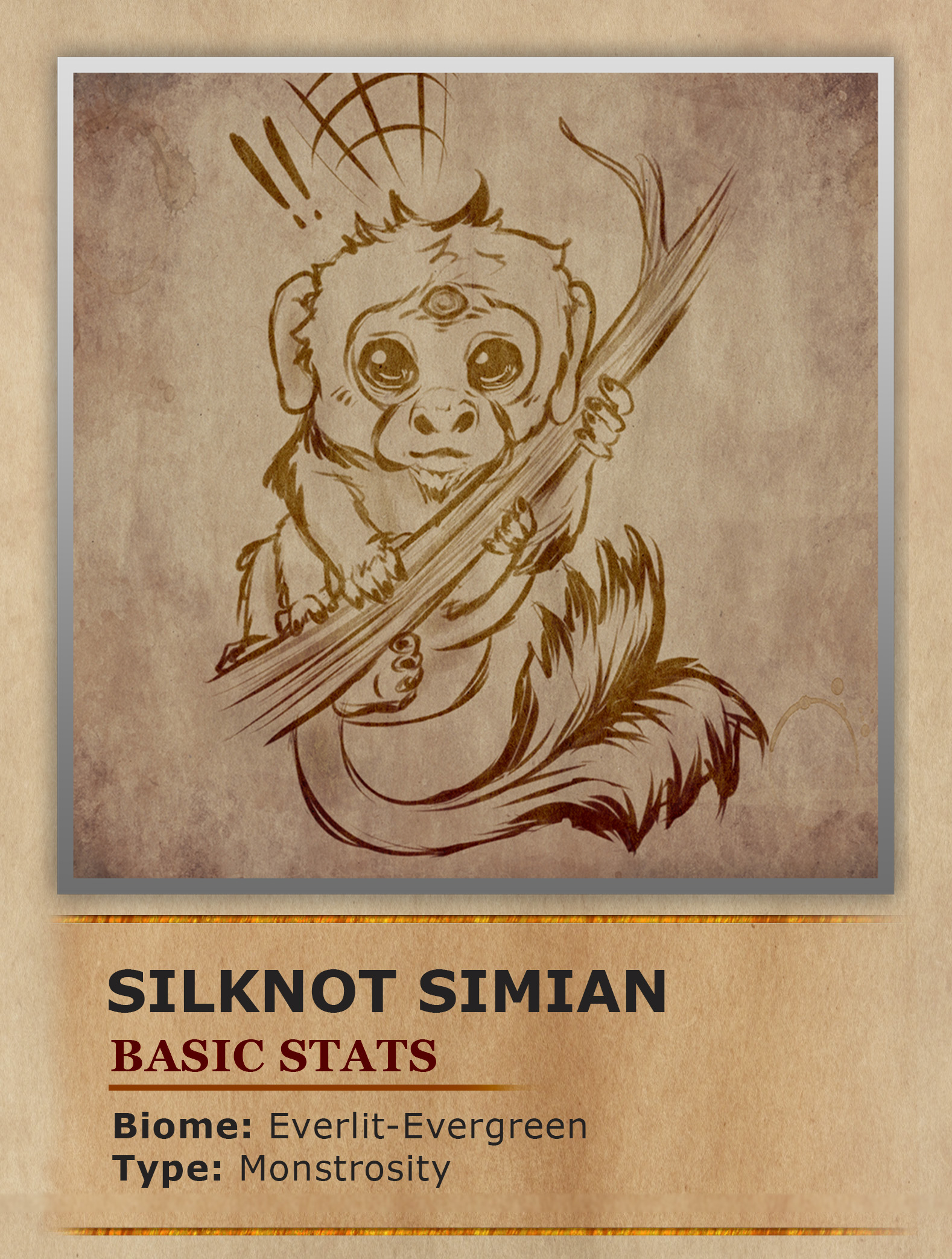 Silknot Simians are a small species of primate native to the Everlit-Evergreen forest. They typically live in large tropes high up in the glowing tree canopy. Here they use their two sets of arms and the silken thread they produce to expertly navigate their arboreal environment. They once were simple monkeys until the fey magic produced by the Everlit-Evergreens enchanted pond mutated their DNA with arachnids. This mix with arachnids allows them to produce a strong spider-like silk. They use this silk to help strengthen their canopy structures and help defend against predators. The silk is even used by mother Simians in order to stick their children to their backs. This lets the adults utilize all their limbs while also ensuring their children are secure. Their mutations not only gave them spider like abilities, it also gave them increased intelligence and arcane mastery. Their arcane prowess can be observed by the third eye in the center of their head, which glows when being utilized. While their full magical abilities are unknown it seems that their third eye gives them a sense of clairvoyance to upcoming events. As this clairvoyance alerts them to incoming predators it gives the primates either time to flee or hide. They are experts at hiding by using the ends of their tails that look like part of an open flower. So all they have to do is huddle together and fan out their tails to trick predators into thinking they are merely a flower instead of a tasty monkey snack. The colorfulness of their tails is a crucial way for how males attract a mate. As the male with the most brightly colored tail is usually seen as the most desirable.
