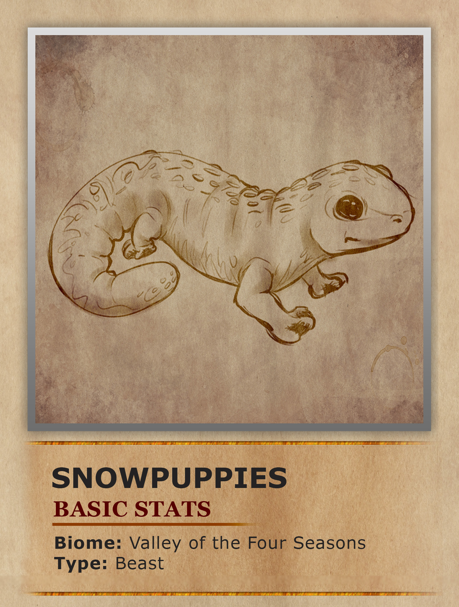 It is believed that the Snowpuppies originated from a more tropical area outside of the Valley of the Four Seasons, before large numbers migrated into the valley. At first the Snowpuppies' bodies would have been adapted for warmer climates and thus the first settlers to the Valley would have struggled to survive. However, the survivors continued to adapt to this chillier environment, until we ended up with the Snowpuppies of today. Now Snowpuppies are well adapted to the winter region of the valley. They grew in size to better retain heat and developed a thick layer of blubbery skin. If temperatures get too cold even for their thick skin Snowpuppies have been observed forming large cuddle piles underneath the snow, in order to better retain heat. Even while not fully hidden beneath the snow they can be difficult to spot, as their originally yellowish orange skin turned into a more fitting whitish blue. Despite their name Snowpuppies are not canines but are instead a large species of amphibian. Their name instead comes from their docile and friendly demeanor.