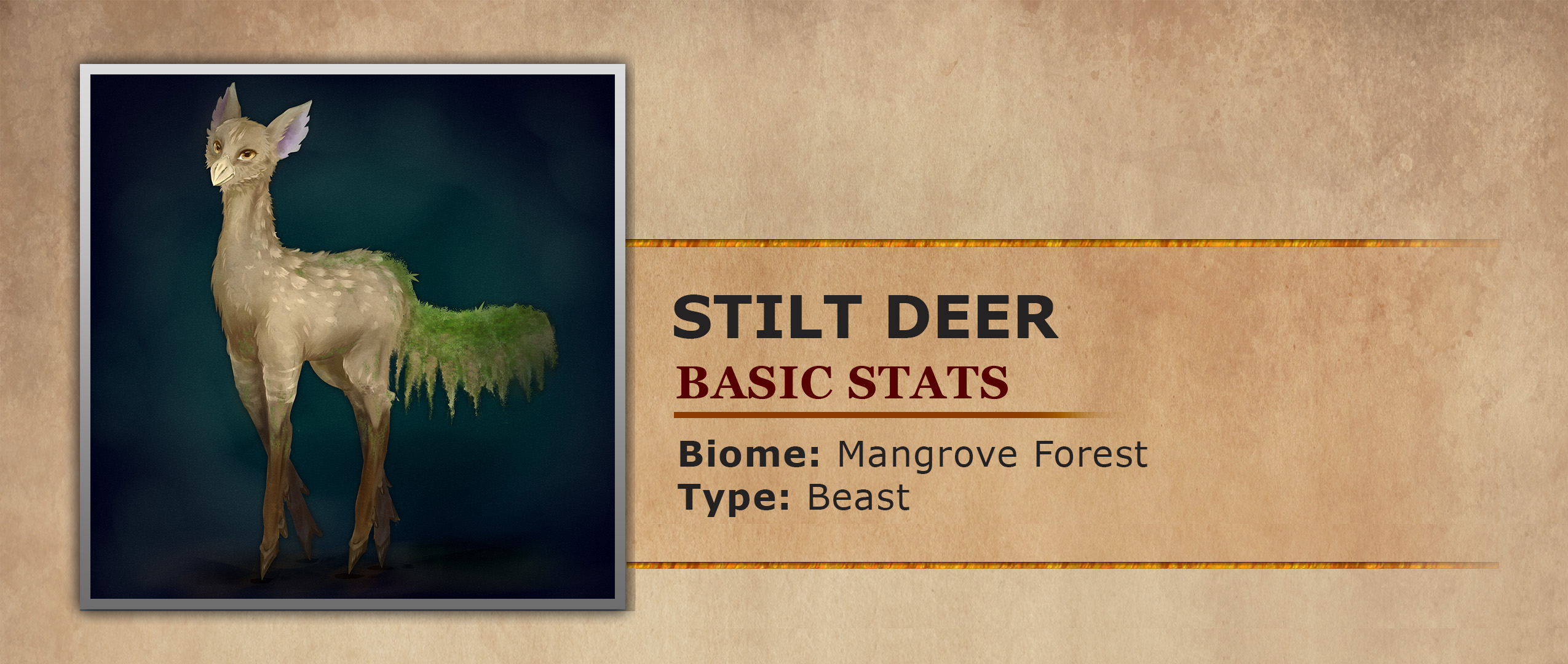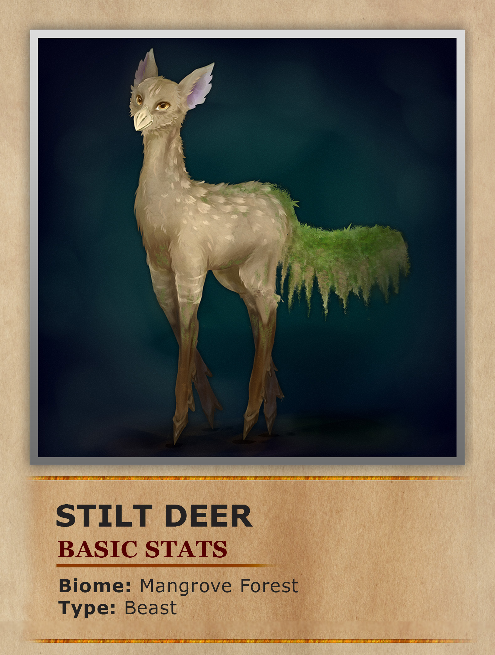Native to the mangrove forests of Crius, Stilt Deer are elegant, ungulate mammals uniquely adapted to their watery habitat. Their most striking feature is their elongated, slender legs, tipped with razor-sharp hooves, allowing them to traverse the muddy channels with ease. These powerful limbs enable them to move swiftly through the terrain, evading predators and navigating the tangled roots of the mangroves.