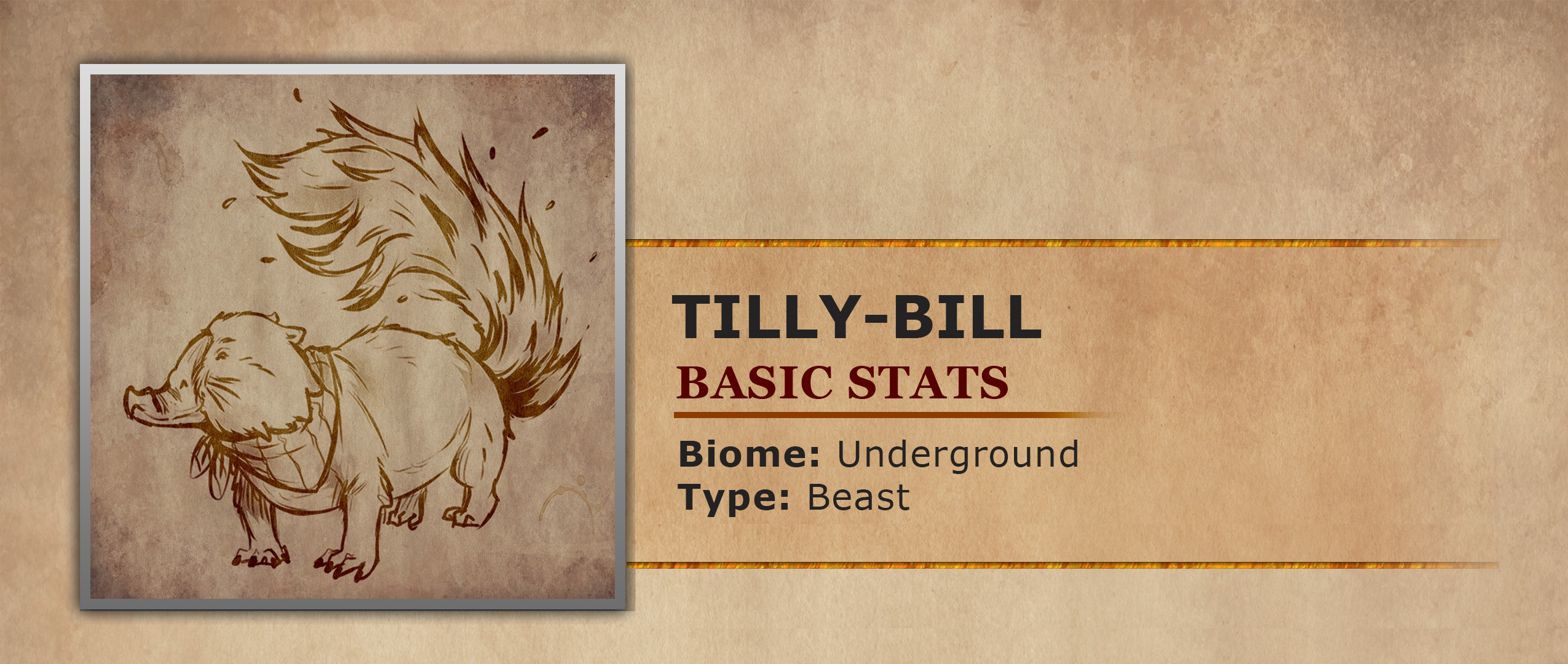 The Tilly-Bill is a four legged, small mammal that is often found employed on underground mushroom farms. Their small size allows them to easily squeeze through tight passageways and burrows. While their shovel shaped bills come quite handy for plowing farmers fields. In these low light environments it might be hard for typical creatures to see where they need to be plowing the fields in the first place. Luckily, for the Tilly-Bill their bill contains sensory receptors that allow them to sense electromagnetic fields. In this world of almost complete darkness this sensory method has replaced their traditional vision. Farmers utilize this sense by placing mildly electrified wires above the fields where they need to be tilled, so the Tilly-Bills will know exactly where they need to dig. Farmers using this method also have the Tilly-Bills plant the seeds for them. As the large fluffy tail of Tilly-bills are statically charged, allowing the tails to store seeds. Then when the creatures wish to get rid of said stored seeds they simply shake their tails, allowing the seeds to fall into the freshly tilled fields. The usefulness of these creatures rarely goes unappreciated by farmers. This is why many Tilly-Bills are gifted articles of clothing with bioluminescent properties. That way farmers can be sure to always keep an eye on their beloved helpers.