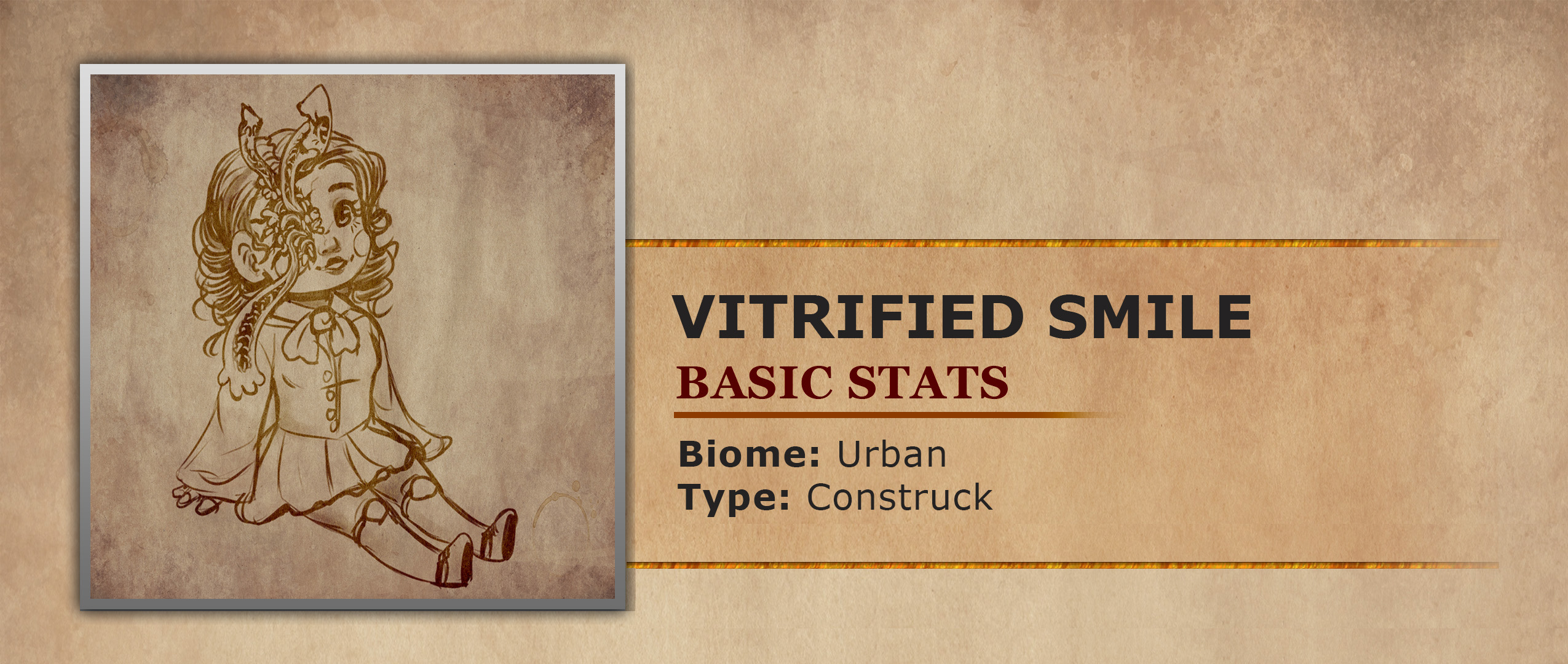 There is an old ghost story told in orphanages around Veargreum, about the cursed doll called the Vitrified Smile. The story tells about a toymaker who made a deal with powerful forces, to make a toy that would watch over and protect children. Well the deal the toymaker made worked and the Vitrified Smile doll was created. This toy appears to be a typical porcelain doll of a young girl, with a sweet smiling face. What was not known to the toymaker was that the doll's protection would work too well. After the dolls were sent out to the toymakers town disappearances and murders began running rampant. The connection was unknown for a while, until the town noticed it was only the parents of children who bought the Vitrified Smile that were dying. It would seem that the Vitrified Smiles were prone to become not just protective of their chosen child but obsessive and dangerous. This obsession would lead the doll to get rid of the children's parents, to insure they had the child all to themselves. Some say the doll would only kill cruel or neglectful parents, while others say it would kill indiscriminately. Whatever story you believe, one thing is true. Nobody wants a visit from a porcelain doll that bears a Vitrified Smile.