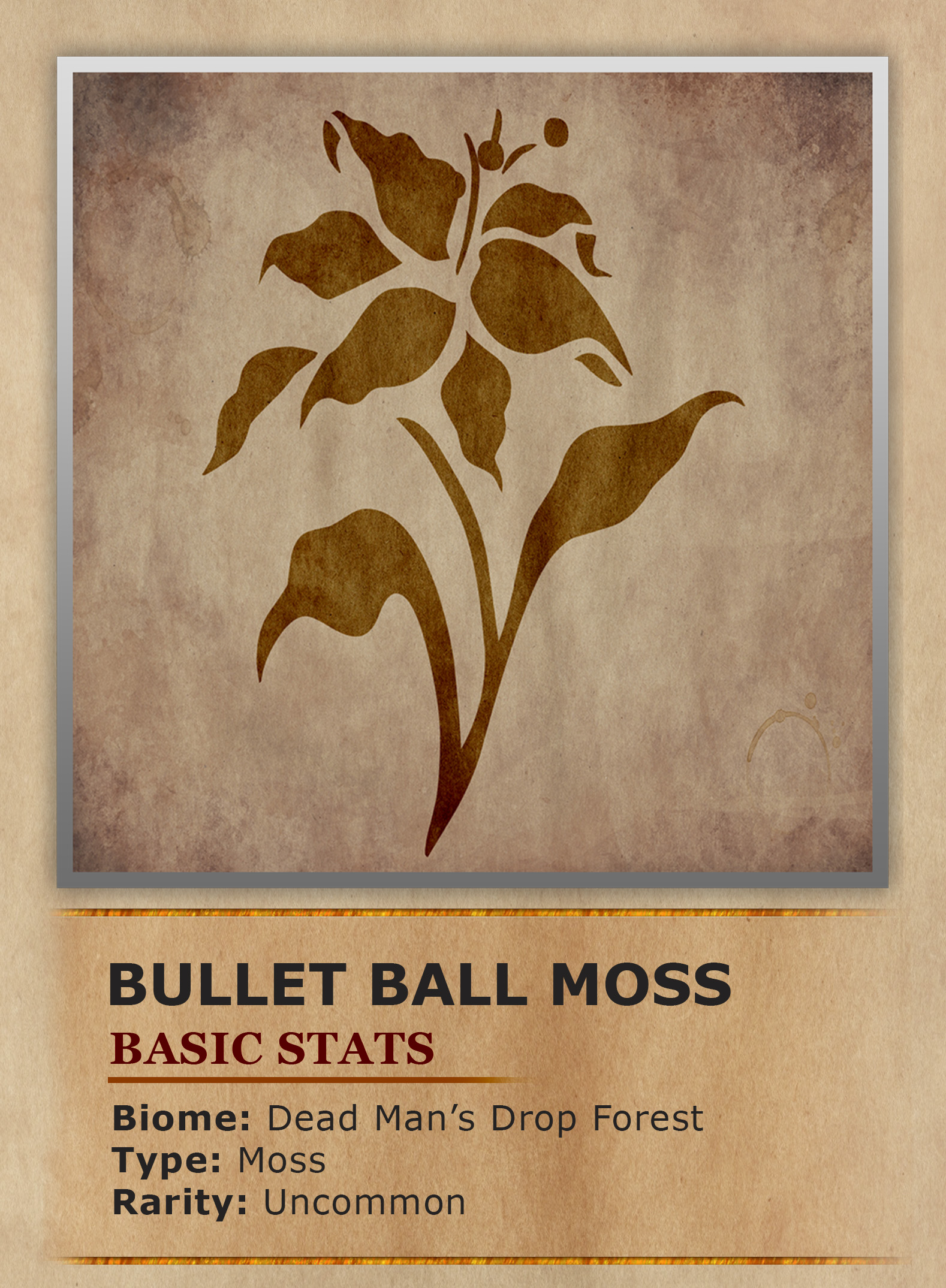 Growing within the shade of the tree canopy in Dead Man’s Drop Forest is a strange type of moss. The moss grows in on itself, forming into dense spherical clumps. These clumps are held together by an intricate root system so dense that after enough growth the structure becomes as hard as rocks. Their structural integrity helps deter herbivores from taking a bite out of them. Unfortunately, the trade off for their strength is they grow too heavy to maintain their position in the tree tops. At this point their spherical shape and weight causes them to fall from the tree tops onto the forest floor. Once on the forest floor they make great food sources for ground dwelling crustaceans. These crustaceans are used to eating hard seeds, enabling them to be able to consume the Bullet Ball Moss. Any moss that falls to the forest floor and is too hard for these crustaceans to eat, are normally the mosses that are able to release their spores. Starting the cycle all over again and ensuring the moss with the strongest spheres continues on. Natives to the forest sometimes use found Bullet Ball Moss as projectiles. Either being thrown or loaded in slingshots or more sophisticated shooting weapons.