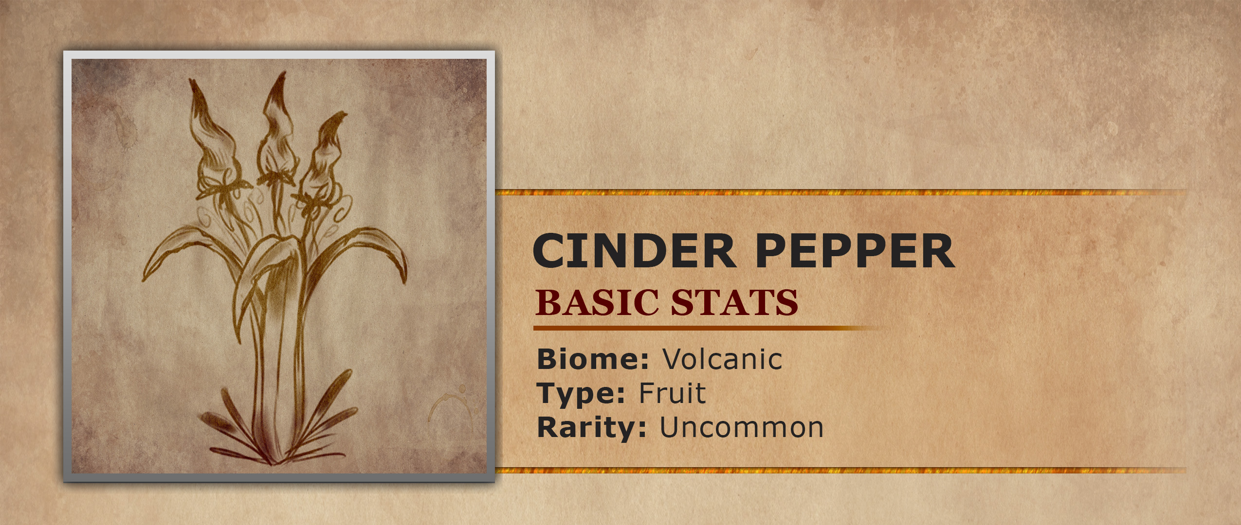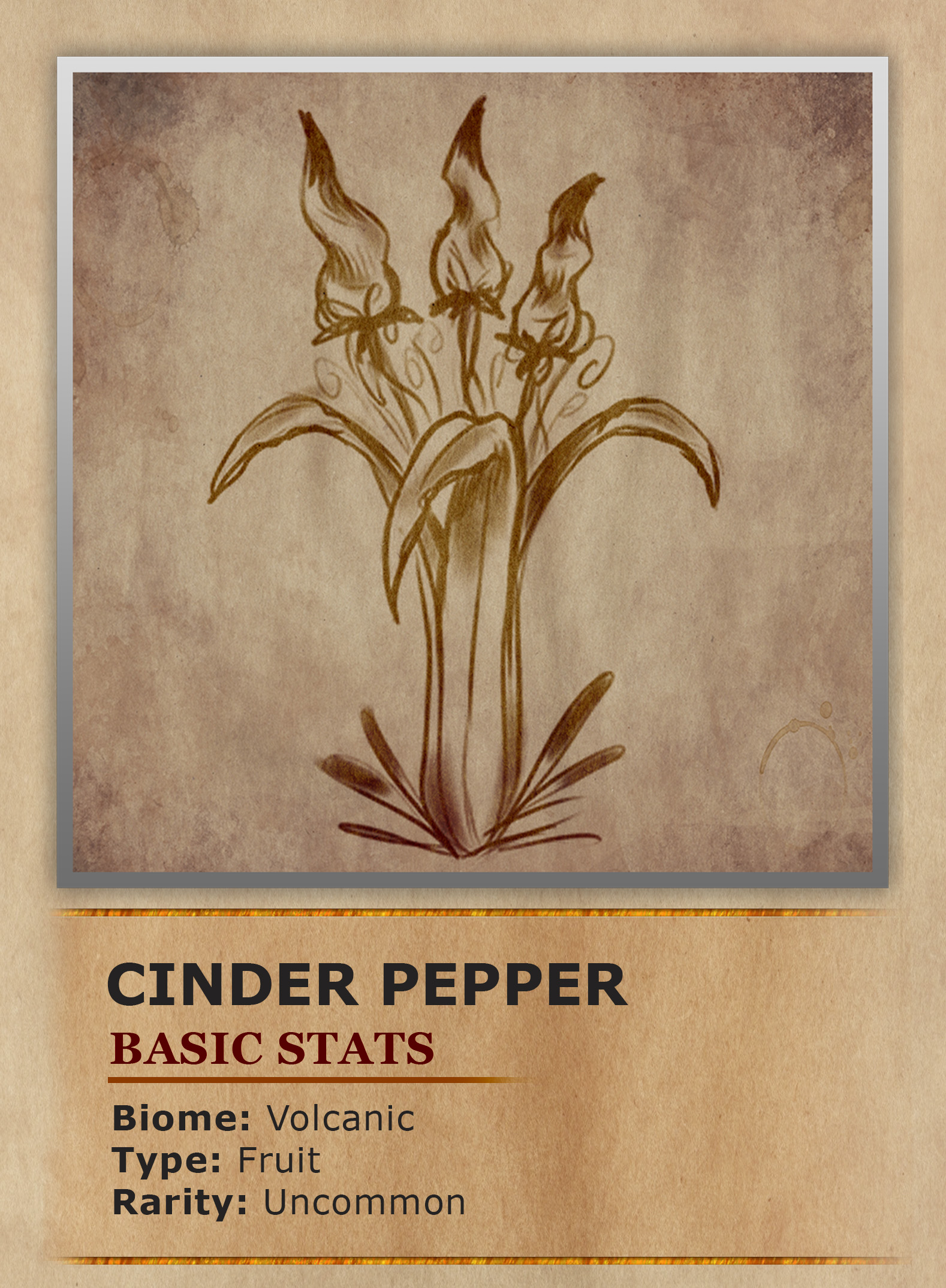 Cinder Peppers are a type of spiced fruit which thrives on the soot in volcanic regions where they grow. The volcanic birds living here love their seeds, which when processed in their stomachs transform the oils coating their feathers into a heat proof membrane. In turn the birds consuming their seeds help the Peppers too. When the seeds are eventually deposited to other volcanic sites by the birds. Those who have tried the Peppers describe them as giving off an intense heat when eaten, and then a cooling numbing sensation. Many chefs love these peppers when making spicy meals. They are also sought out by healers to help numb their patients' injuries.