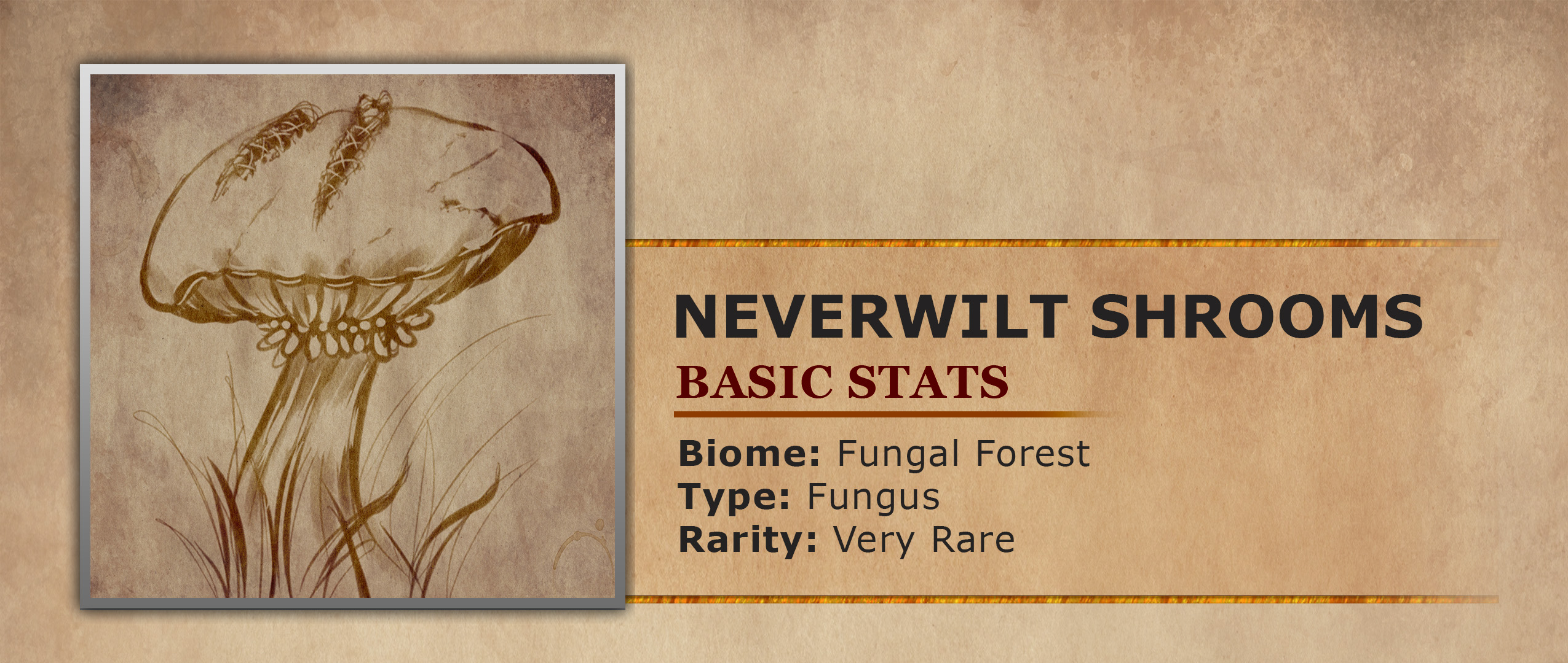 Neverwilt Shrooms are a fascinating fungus located deep within the Fungal Forest. What at first looks like a fairly ordinary mushroom reveals surprising secrets upon closer examination. The discoverers of this fungus were surprised to find that when they cut into the cap of this fungus they found structures that more resemble muscle fibers, rather than normal fungal tissue as expected. It is believed these structures play a role in the fungi's amazing self regenerating properties. For when the Shroom takes damage it will quickly stitch itself back together to repair the damaged area. Since their discovery the Neverwilt Shroom has been highly sought after by those wishing to harness their regenerative abilities. Alchemists who use them to make powerful healing potions, will pay a handsome price to anyone willing to track down the rare fungus.