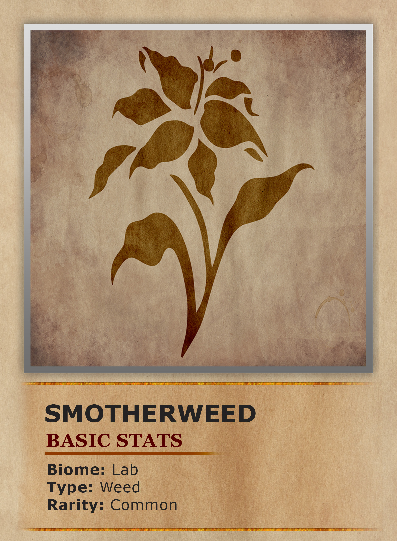 Smotherweed looks like a mass of interlocking net-like roots with thick silver leaves sprouting outward.. They seem to crawl across the ground as they rapidly expand in any given area. Originally these plants were created to test out the effectiveness of alchemically enhanced growth potions. Well the experiments might have been too successful as the plants began growing out of control. Now even a single seed from a Smotherweed will grow exponentially, choking out all other plant life in the area until only it remains. Not just plant life but any unlucky wild-life or even humanoids who aren't careful, might find themselves overtaken by the weeds' rapid growth. The scientists who developed it managed to keep it under control in their special greenhouses. Until of course the lab's destruction allowed the plant to escape. Now there are large areas of the island and lab completely covered with the plant. Luckily the plant seems to be a food source for one of the island's inhabitants helping to curb the population somewhat.