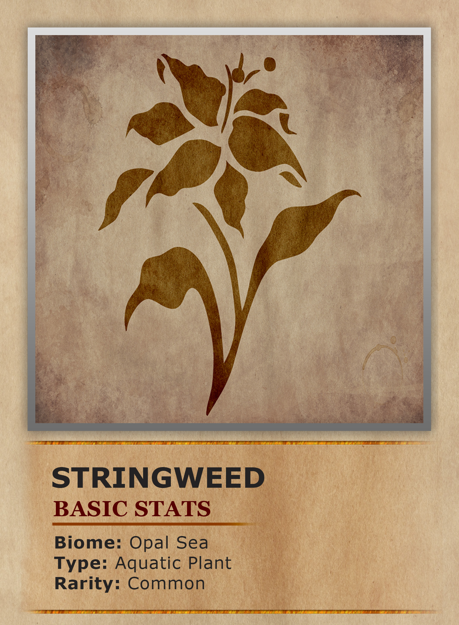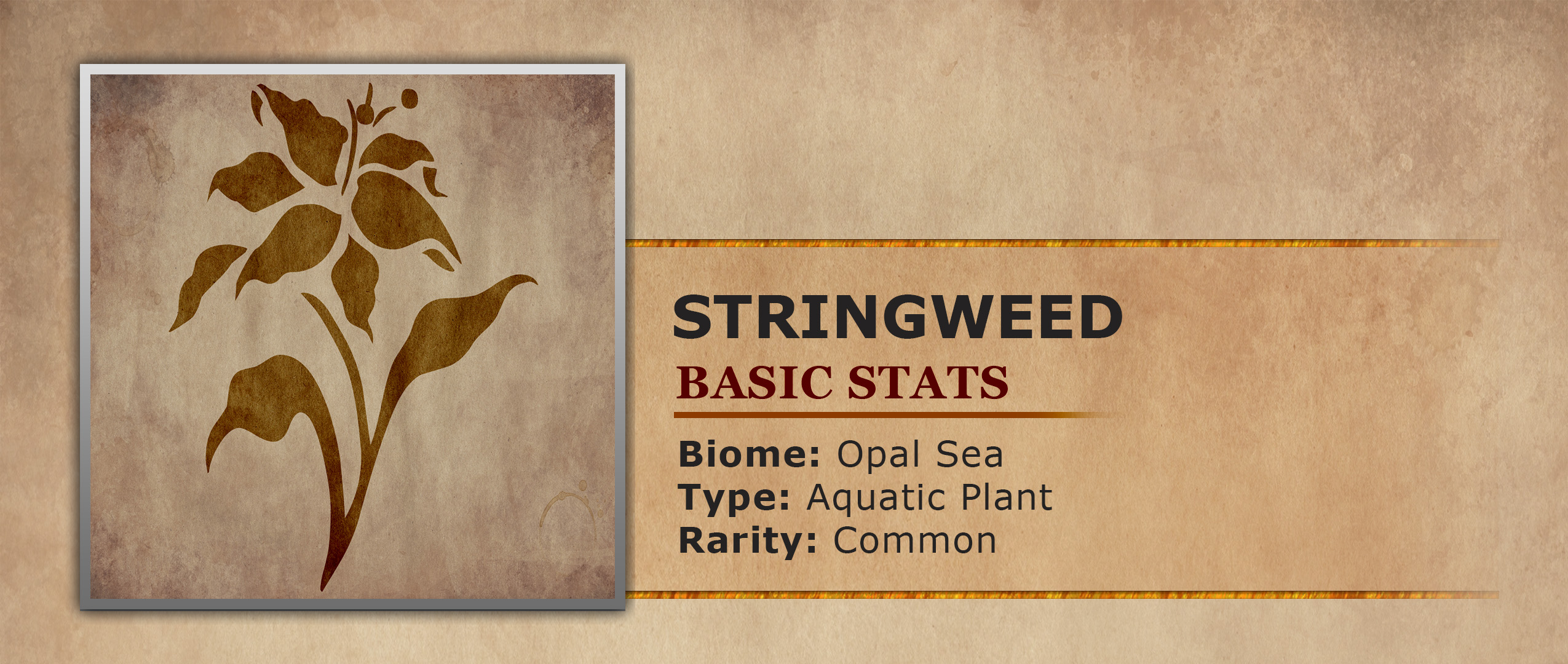 Stringweed is an ingenious marine plant that can be found within the Opal Sea. This plant grows up from the seafloor in long thin strips that wrap around each other to form sturdy rope-like vines. These Stringweed structures are loved by herbivores for their plentiful nutritious leaves. As well as being favored by smaller aquatic creatures who love to hide among the plants. Thanks to the calm waters present here there are not strong currents that would rip the individual plants apart. Individuals who frequent the Opal Sea will often collect Stringweed in order to use it as ropes for their ships and nets, as even out of water it retains its rigidity.