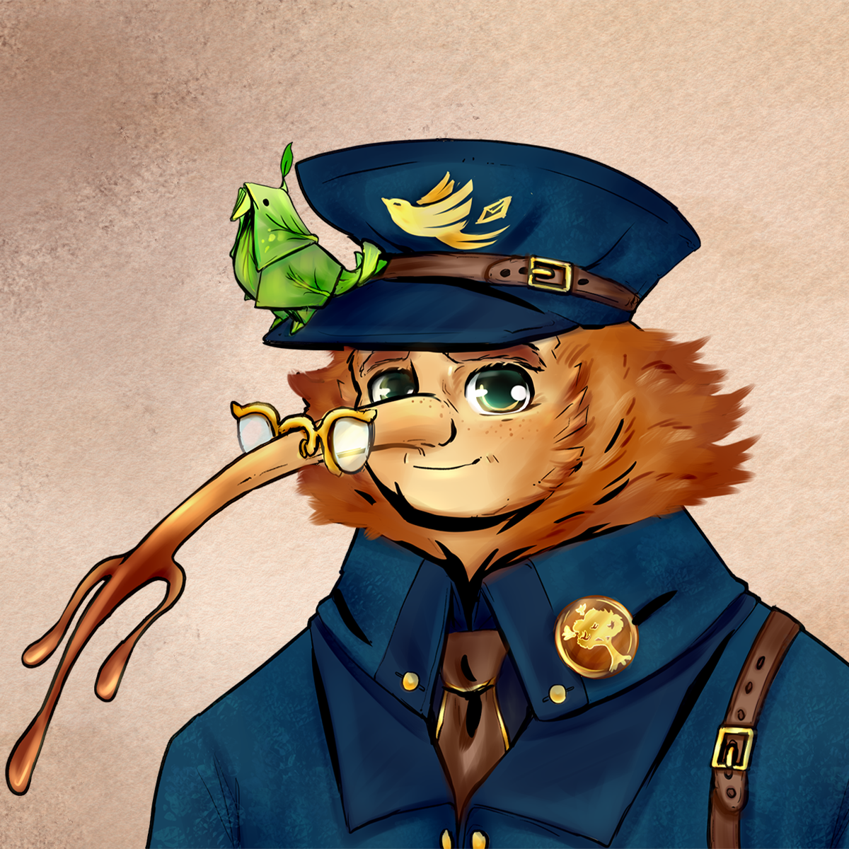 Murt is a happy-go-lucky guy who left his family mail business in theandra to start his own! What a seemingly big task for a weevil saymoran. “No job is too big!” His parents would always say. So, he took that to heart when he decided to start his own; he wanted to reach further lands than his parent’s business allowed. Thus, started Blossom’s Express Delivery Services, going the places you don’t want to. Murt strived to deliver far and wide, through any terrain and any weather. No jobs too big for a weevil after all. His parents (and 75 siblings) taught him well before he left. It’s where he learned all of his navigation skills and bow skills! “Got to stay safe out there!” They all told him. Before he left he was made his Pleat Pigeon, Papyrus, made of our various different kinds stamps to help him on his journey.